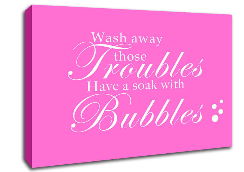 Bathroom Quote Wash Away Those Troubles Bubbles Vivid Pink Canvas Print handmade in the UK. Stretched over a 2 inch thick wooden box frame, ready to hang on your wall.