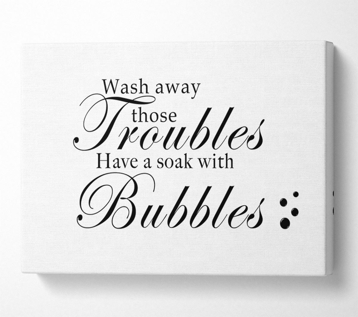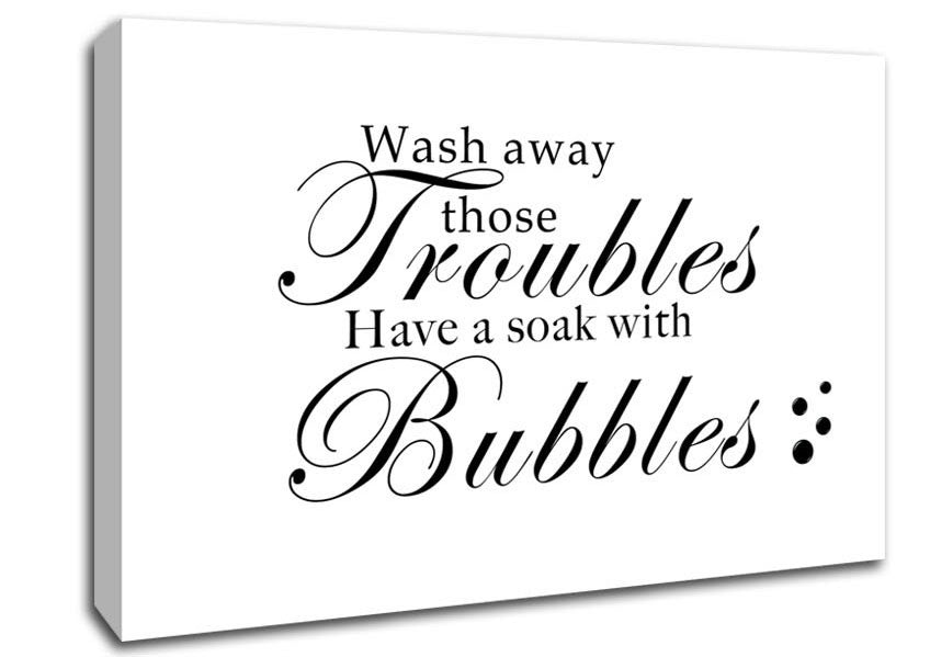 Bathroom Quote Wash Away Those Troubles Bubbles White Canvas Print handmade in the UK. Stretched over a 2 inch thick wooden box frame, ready to hang on your wall.