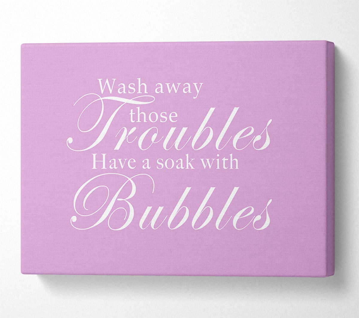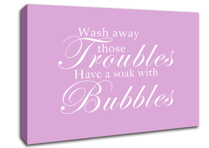 Bathroom Quote Wash Away Those Troubles Pink Canvas Print handmade in the UK. Stretched over a 2 inch thick wooden box frame, ready to hang on your wall.