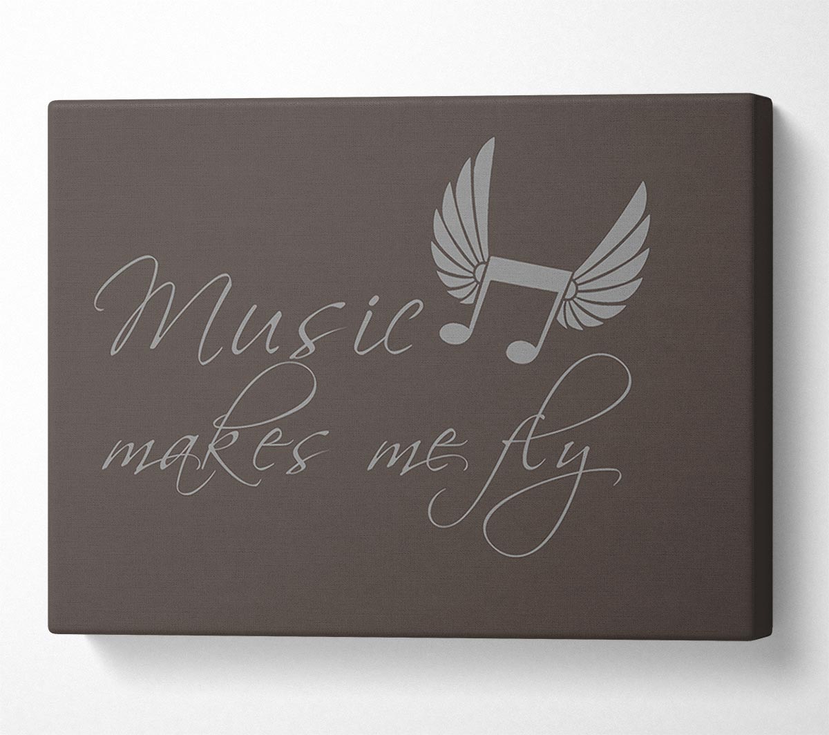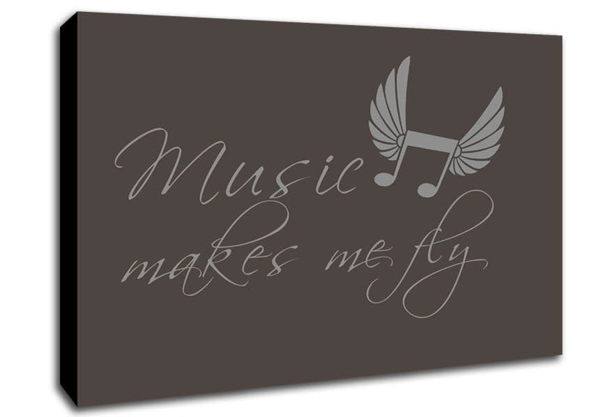 Boys room Quote Music Makes Me Fly Chocolate Canvas Print handmade in the UK. Stretched over a 2 inch thick wooden box frame, ready to hang on your wall.