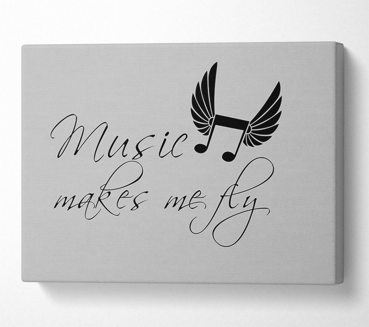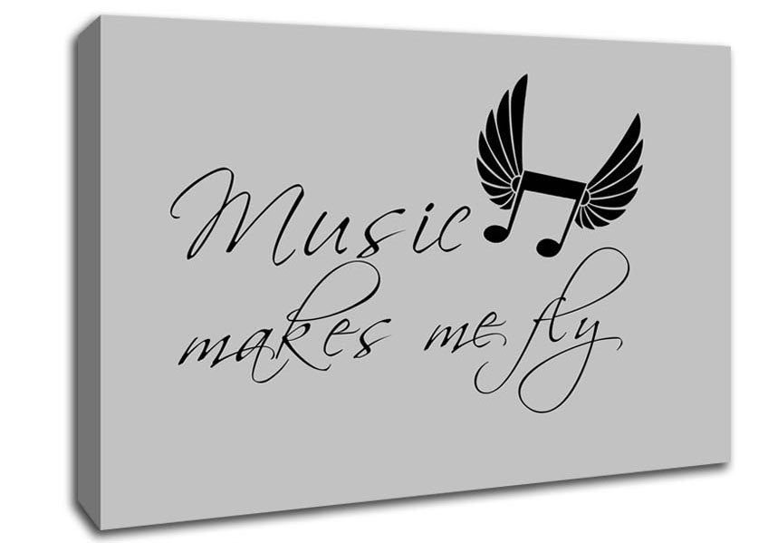 Boys room Quote Music Makes Me Fly Grey Canvas Print handmade in the UK. Stretched over a 2 inch thick wooden box frame, ready to hang on your wall.