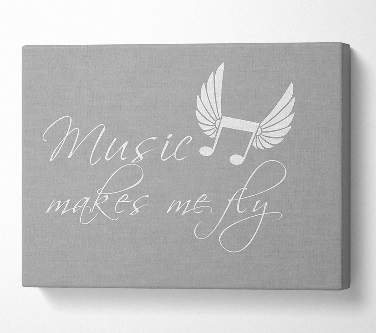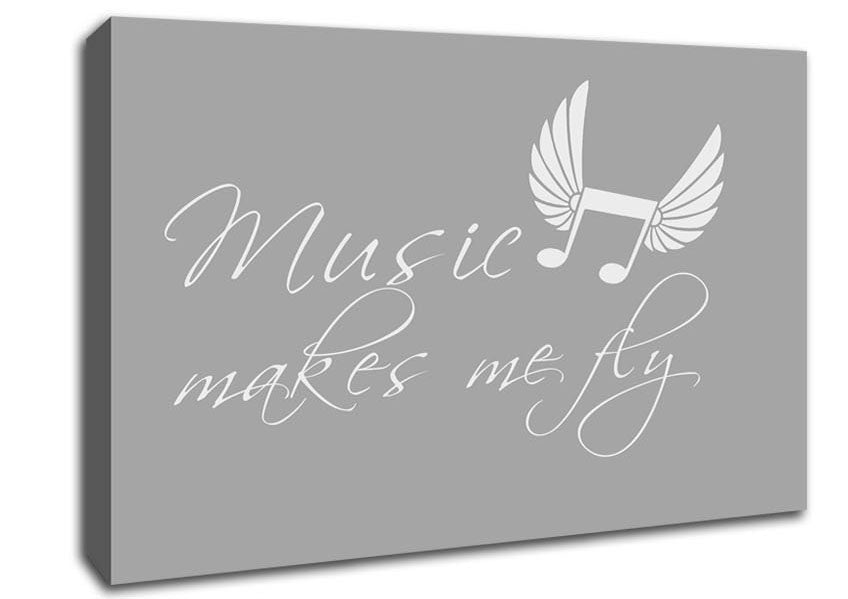 Boys room Quote Music Makes Me Fly Grey White Canvas Print handmade in the UK. Stretched over a 2 inch thick wooden box frame, ready to hang on your wall.