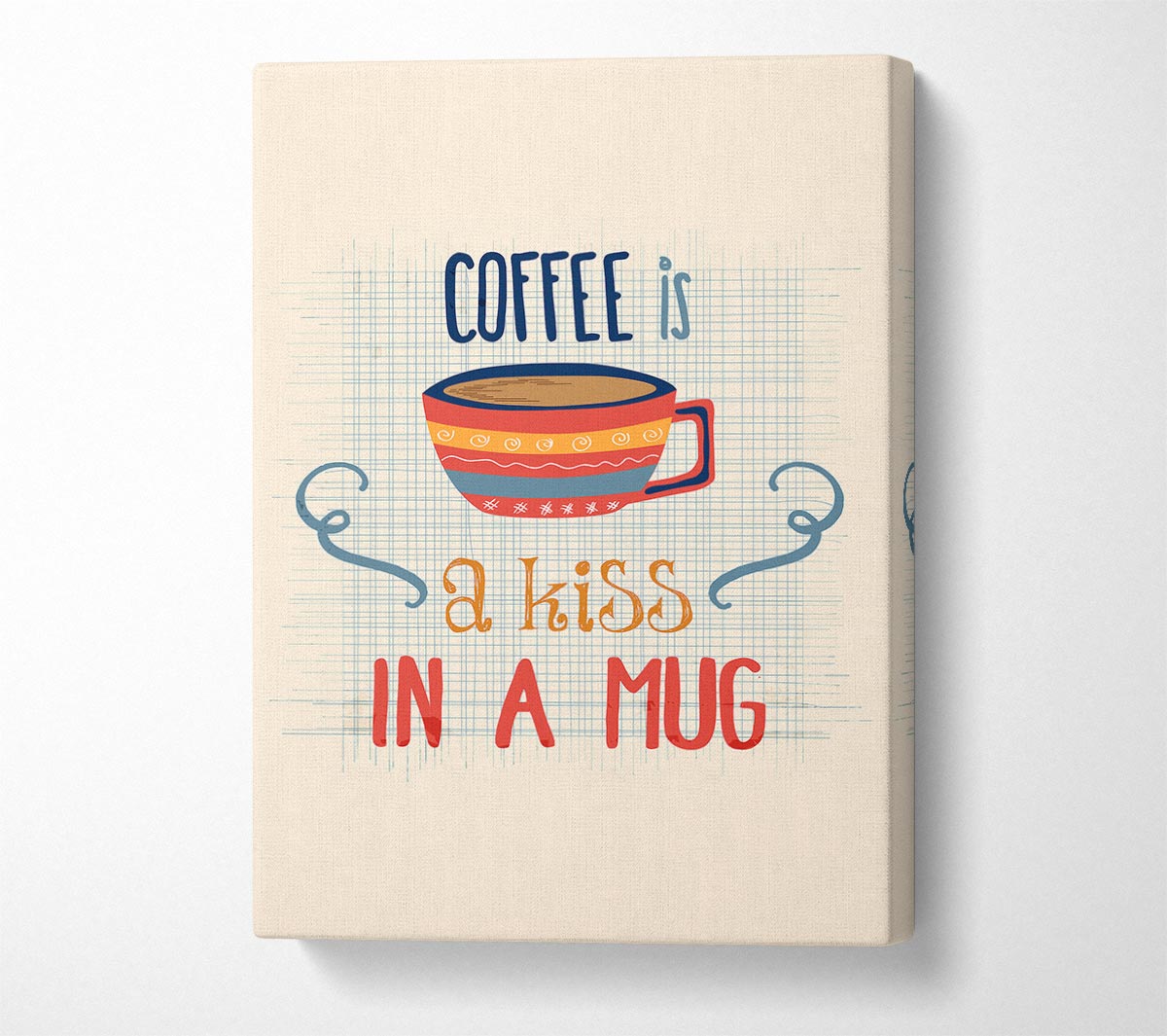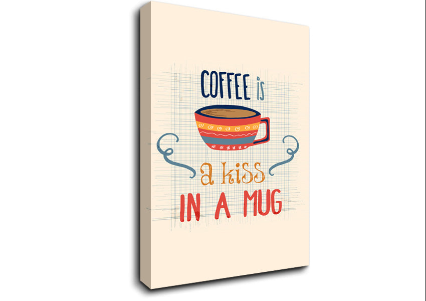 Coffee Is A Kiss In A Mug Canvas Print handmade in the UK. Stretched over a 2 inch thick wooden box frame, ready to hang on your wall.