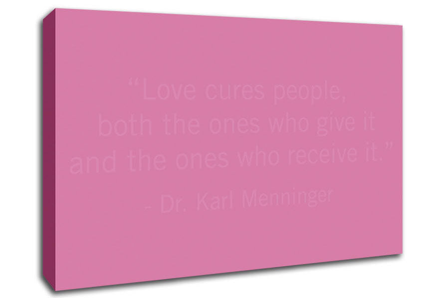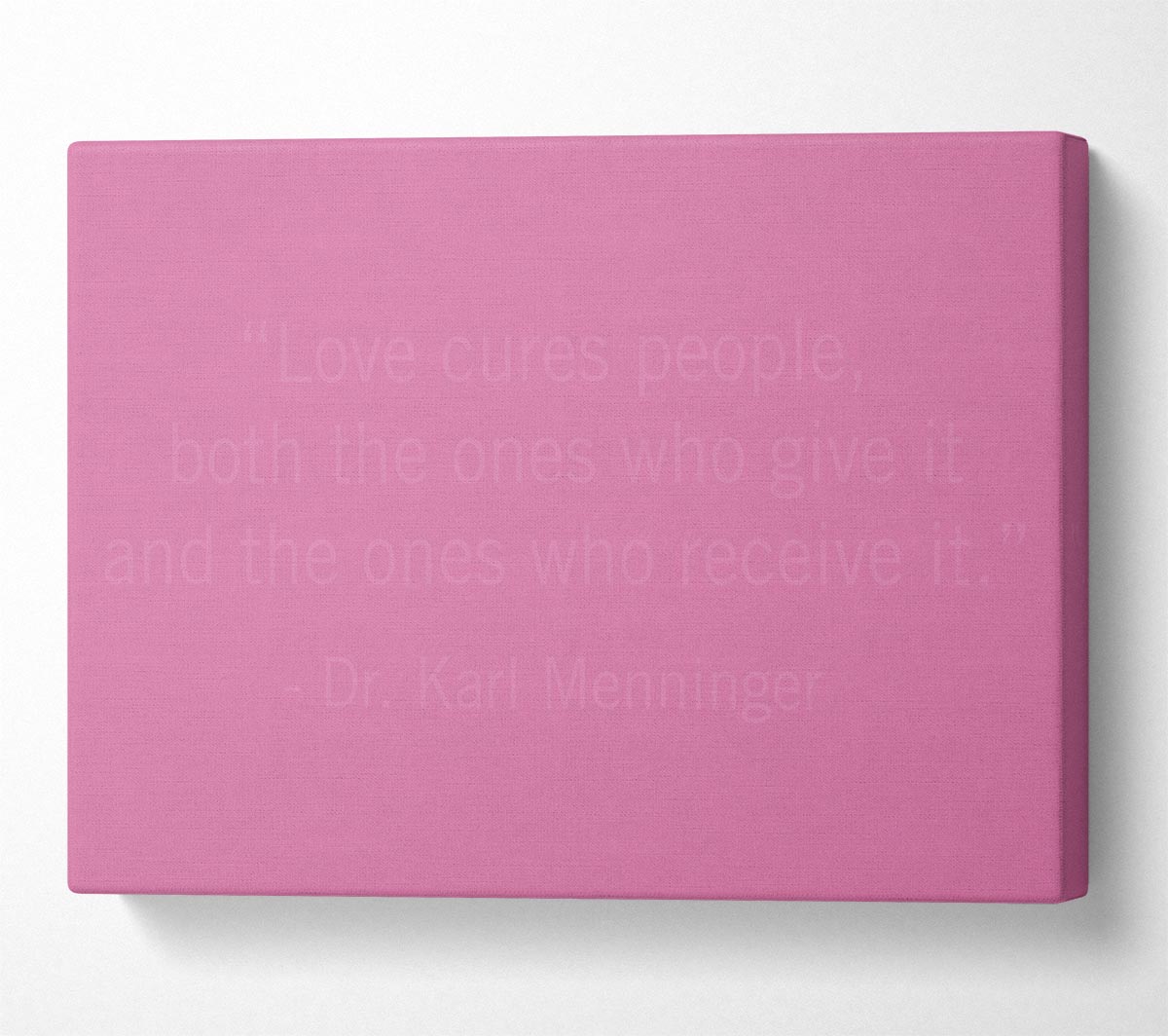 Dr Karl Menninger Love Cures People Pink Canvas Print handmade in the UK. Stretched over a 2 inch thick wooden box frame, ready to hang on your wall.
