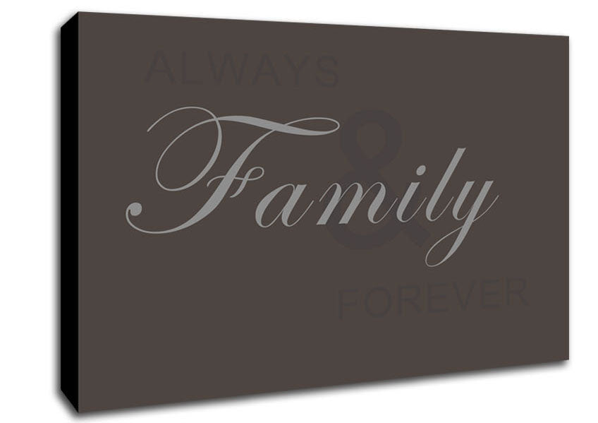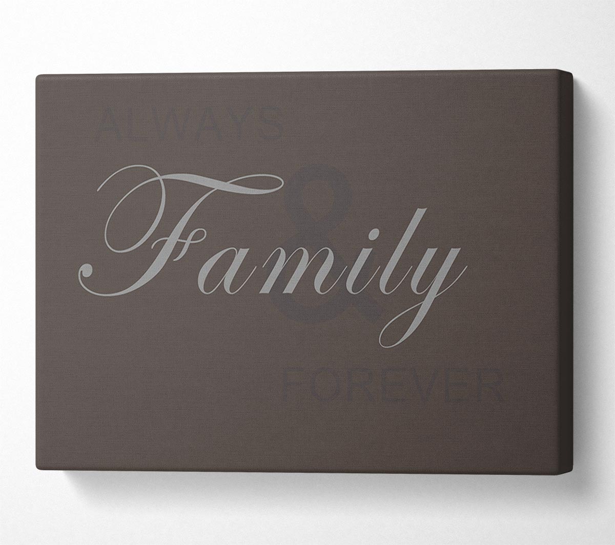 Family Quote Always And Forever Chocolate Canvas Print handmade in the UK. Stretched over a 2 inch thick wooden box frame, ready to hang on your wall.