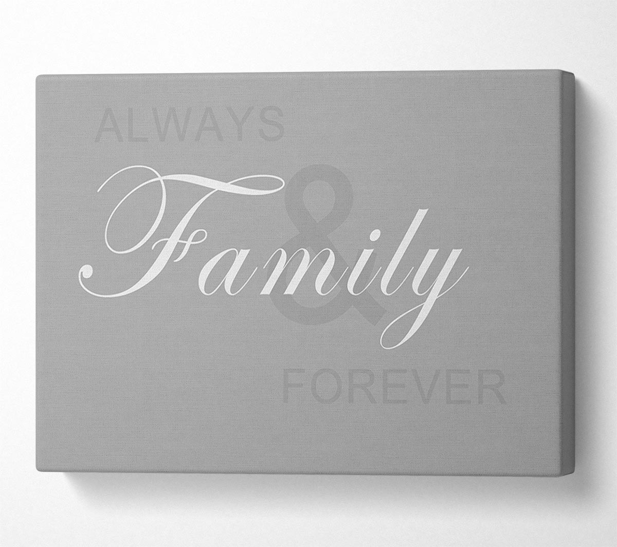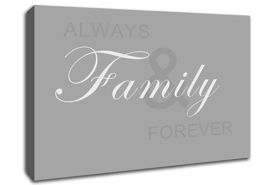 Family Quote Always And Forever Grey White Canvas Print handmade in the UK. Stretched over a 2 inch thick wooden box frame, ready to hang on your wall.