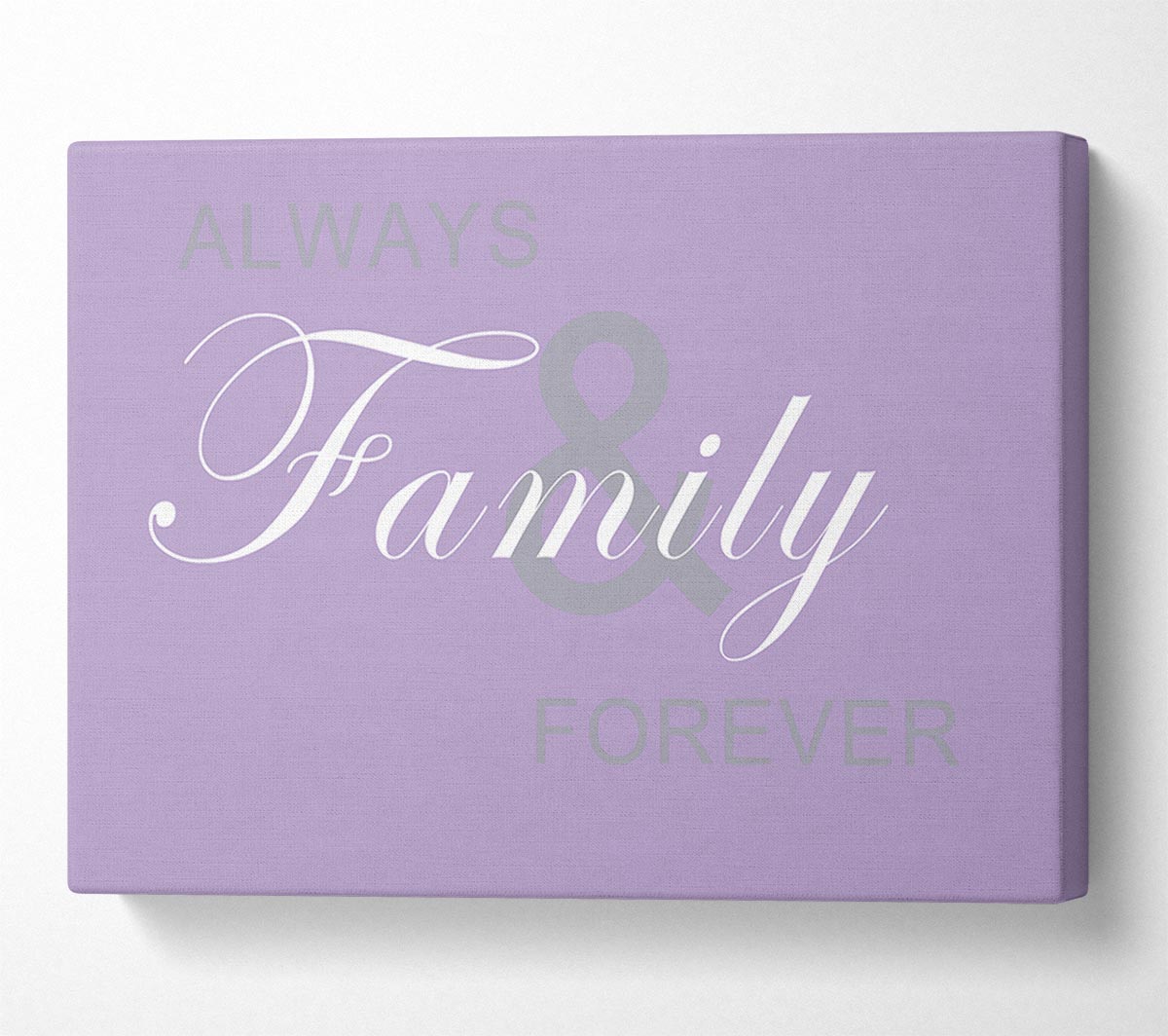 Family Quote Always And Forever Lilac Canvas Print handmade in the UK. Stretched over a 2 inch thick wooden box frame, ready to hang on your wall.