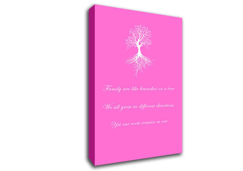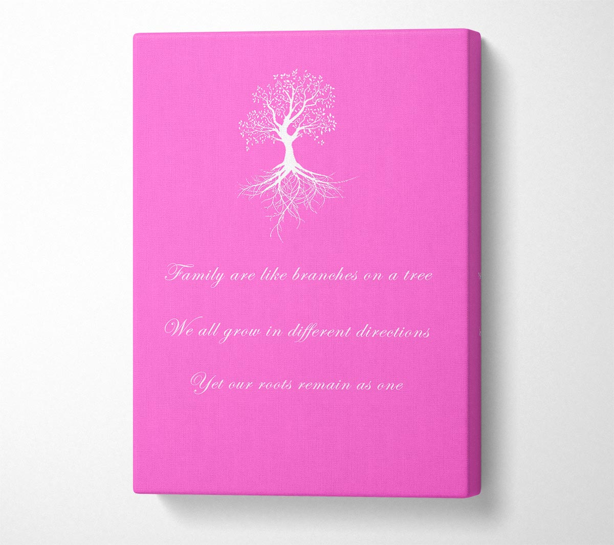 Family Quote Family Are Like Branches 2 Vivid Pink Canvas Print handmade in the UK. Stretched over a 2 inch thick wooden box frame, ready to hang on your wall.