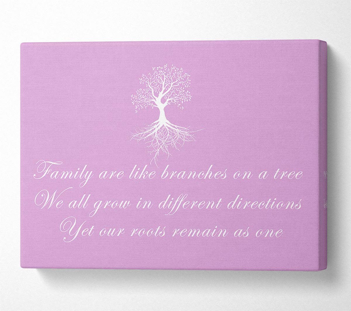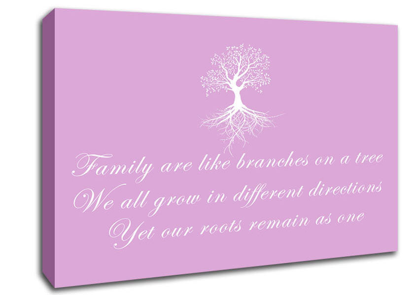 Family Quote Family Are Like Branches Pink Canvas Print handmade in the UK. Stretched over a 2 inch thick wooden box frame, ready to hang on your wall.