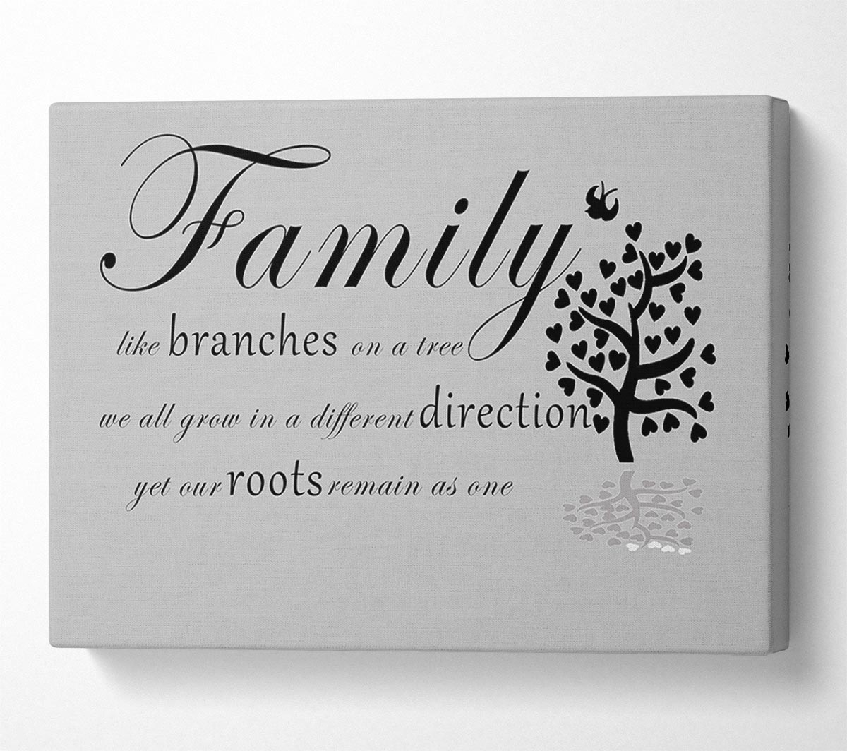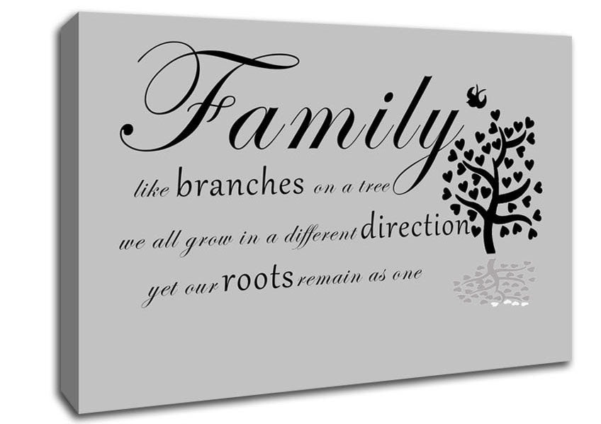 Family Quote Family Like Branches On A Tree Grey Canvas Print handmade in the UK. Stretched over a 2 inch thick wooden box frame, ready to hang on your wall.