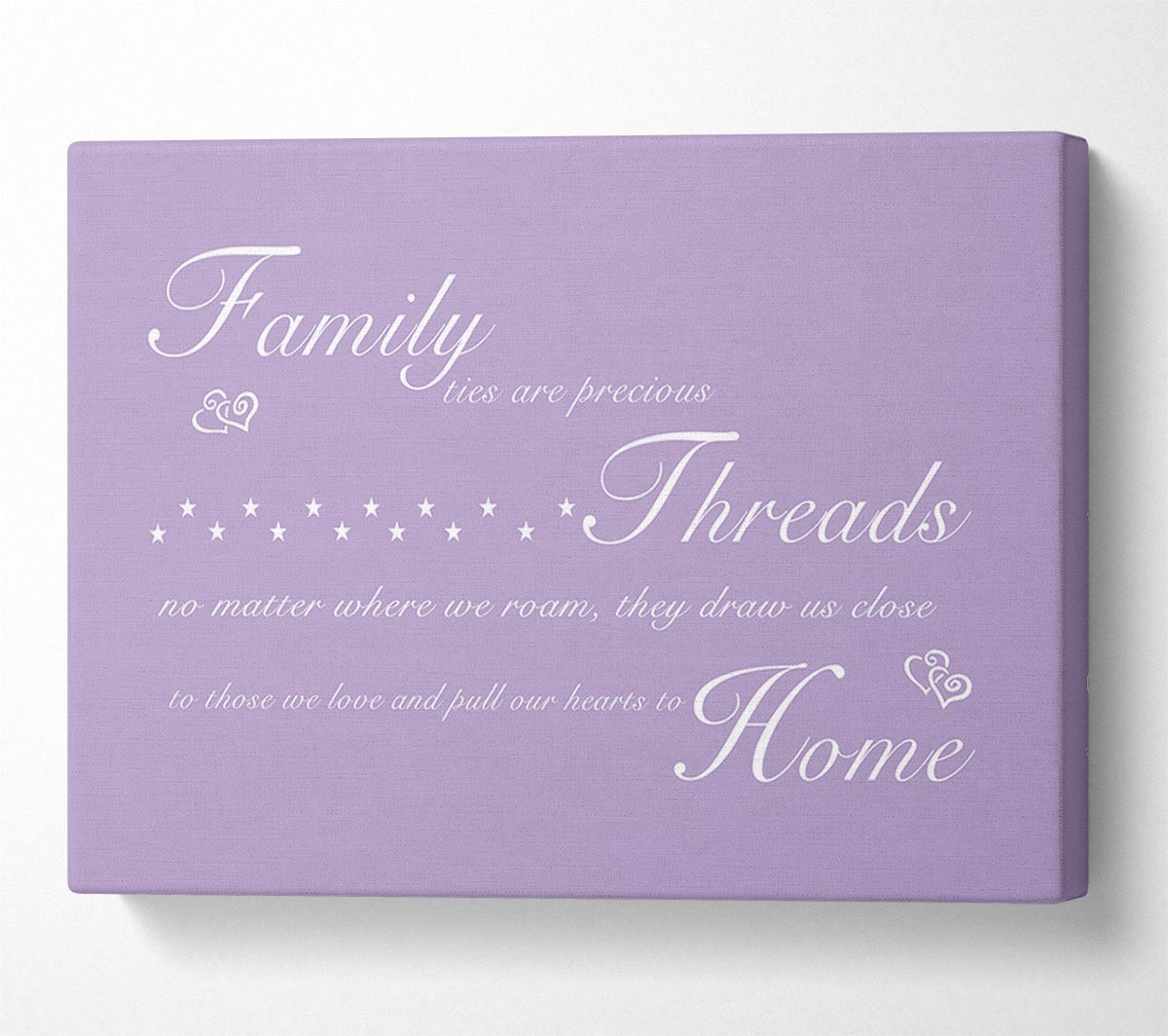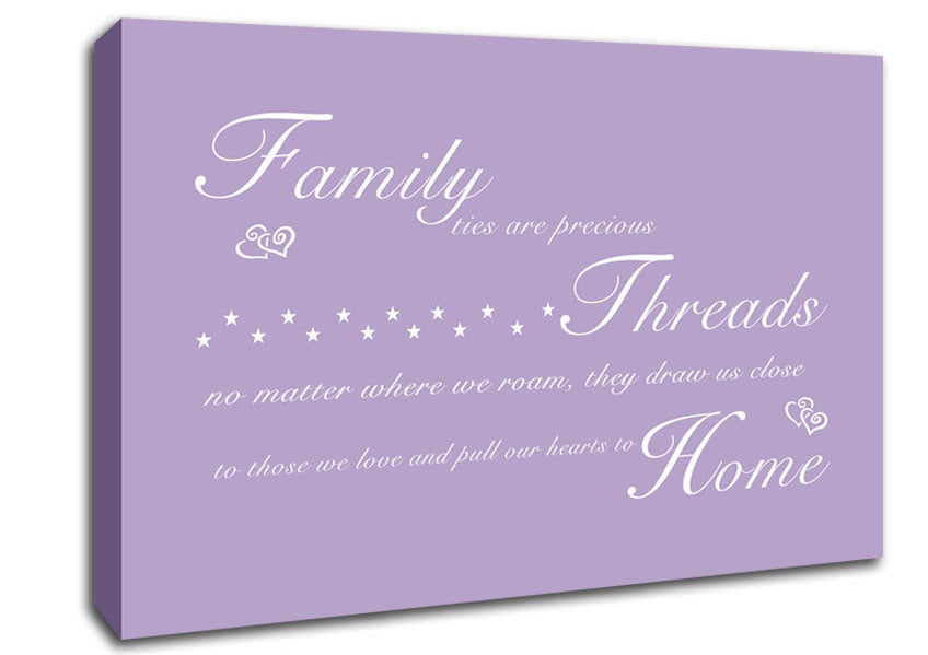 Family Quote Family Ties Are Precious Lilac Canvas Print handmade in the UK. Stretched over a 2 inch thick wooden box frame, ready to hang on your wall.