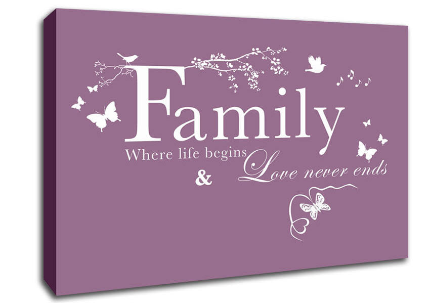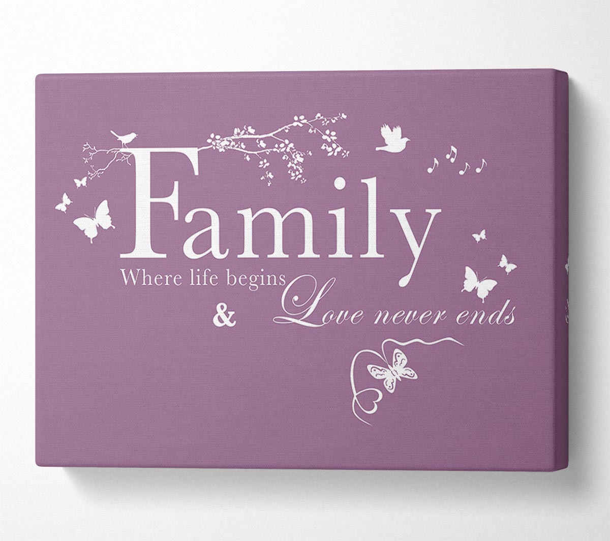 Family Quote Family Where Life Begins Dusty Pink Canvas Print handmade in the UK. Stretched over a 2 inch thick wooden box frame, ready to hang on your wall.