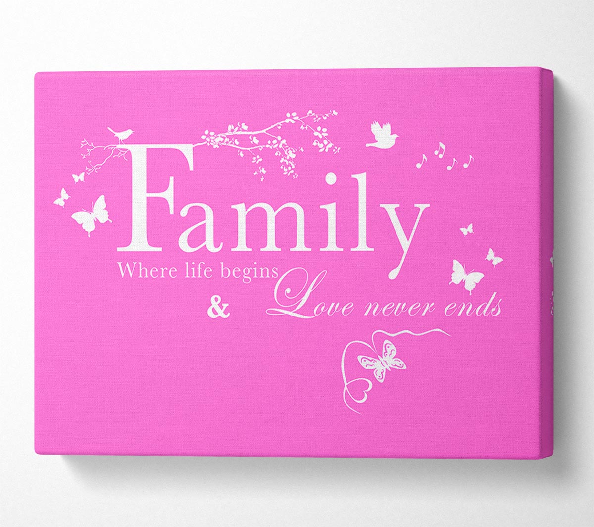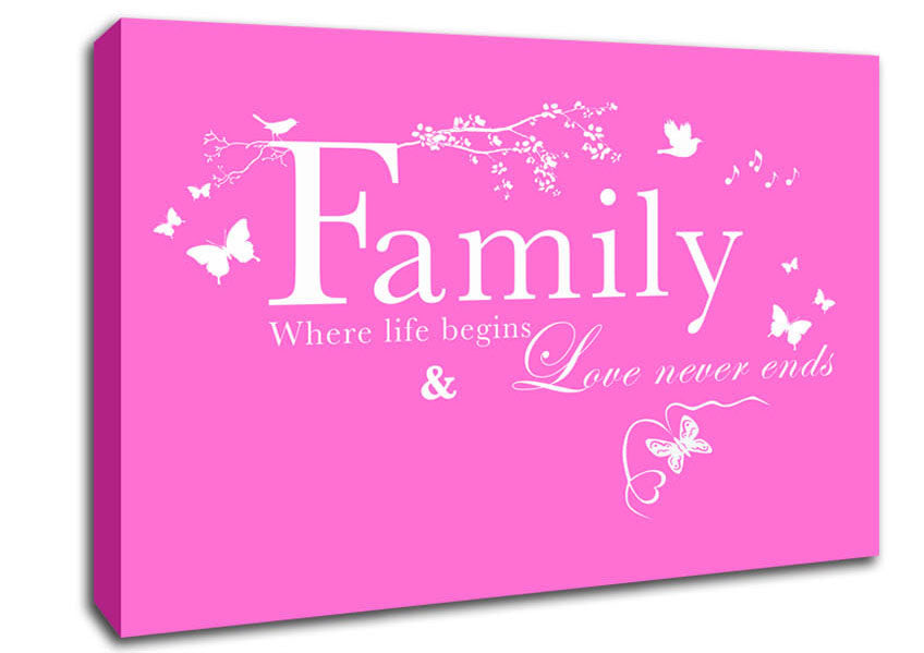 Family Quote Family Where Life Begins Vivid Pink Canvas Print handmade in the UK. Stretched over a 2 inch thick wooden box frame, ready to hang on your wall.