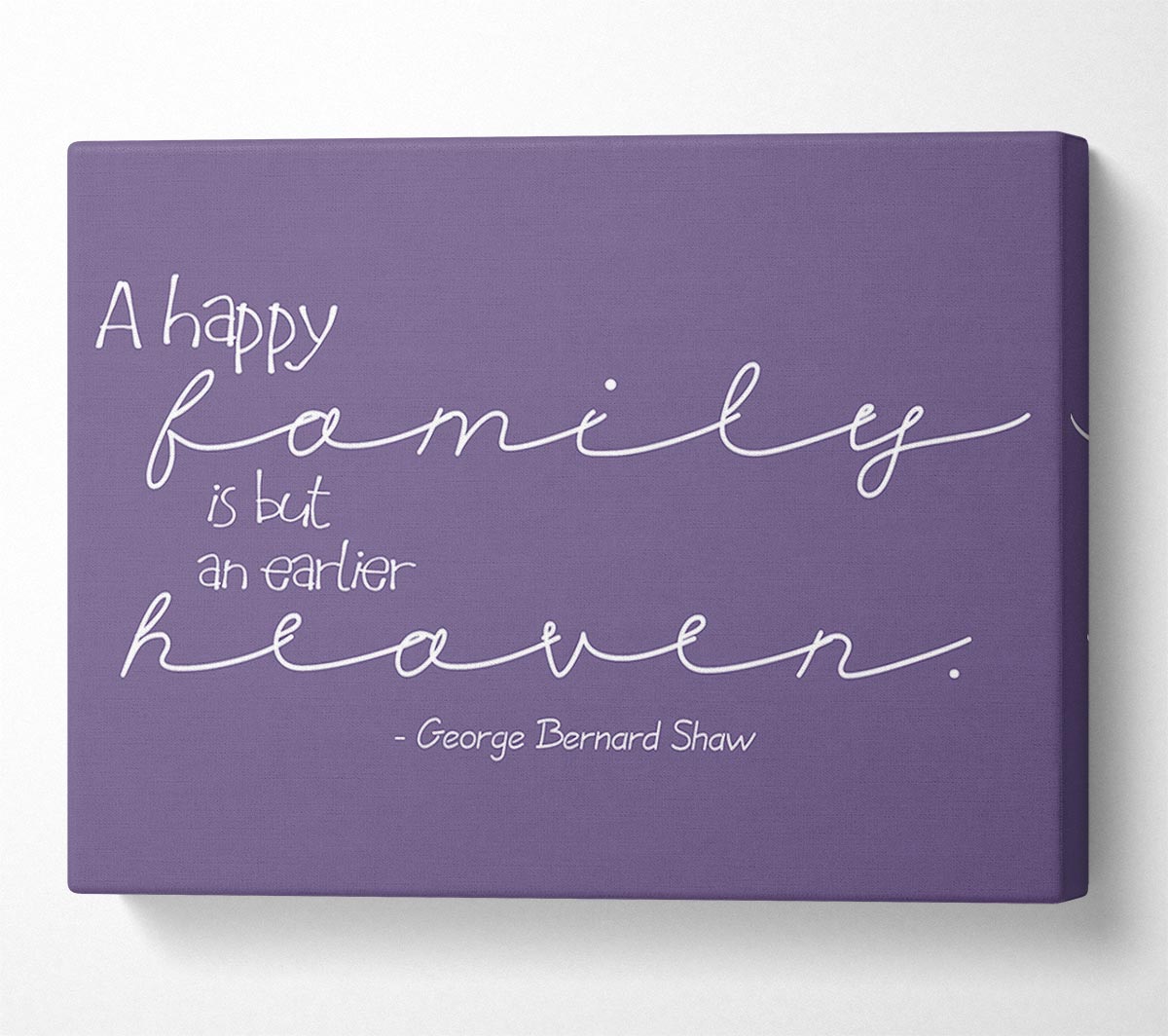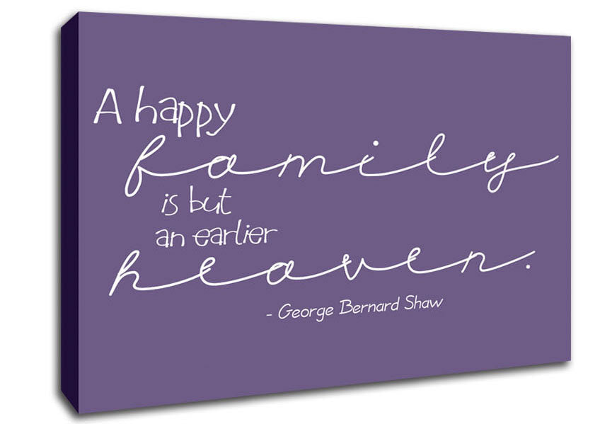Family Quote George Bernard Shaw A Happy Family Lilac Canvas Print handmade in the UK. Stretched over a 2 inch thick wooden box frame, ready to hang on your wall.
