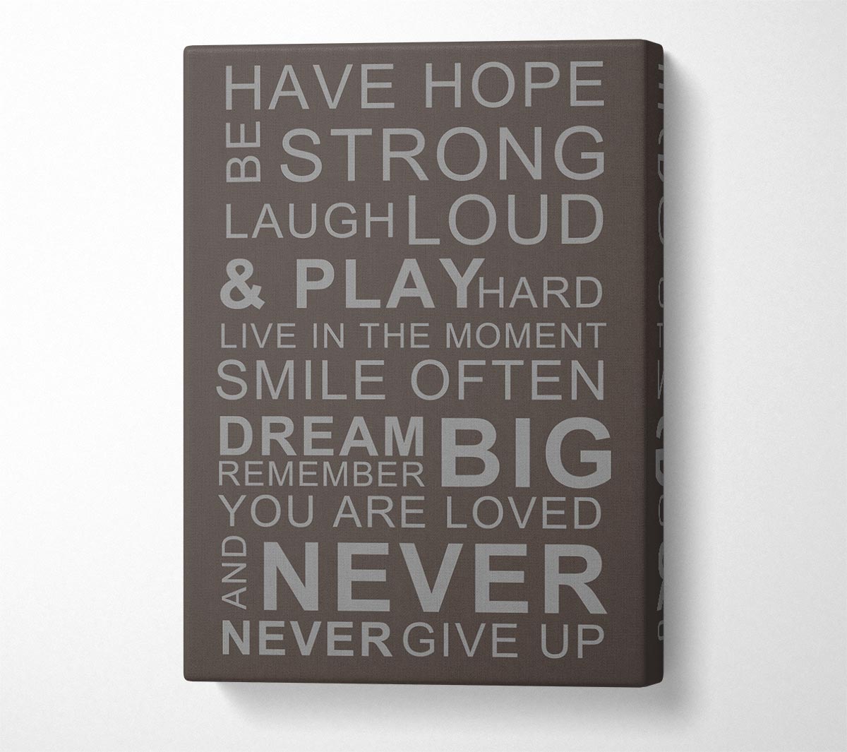 Family Quote Have Hope Be Strong Laugh Loud Chocolate Canvas Print handmade in the UK. Stretched over a 2 inch thick wooden box frame, ready to hang on your wall.