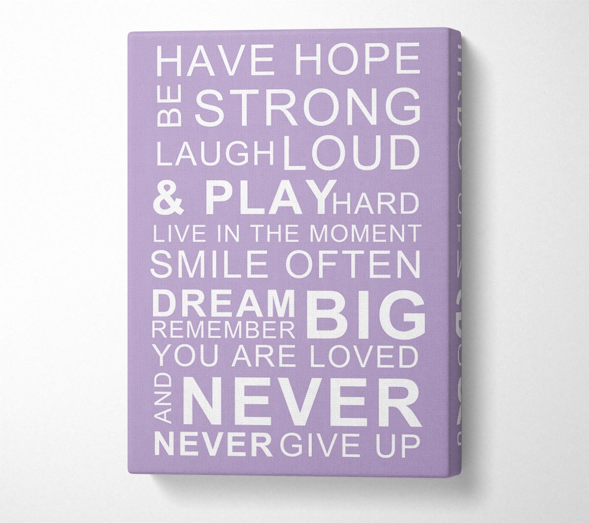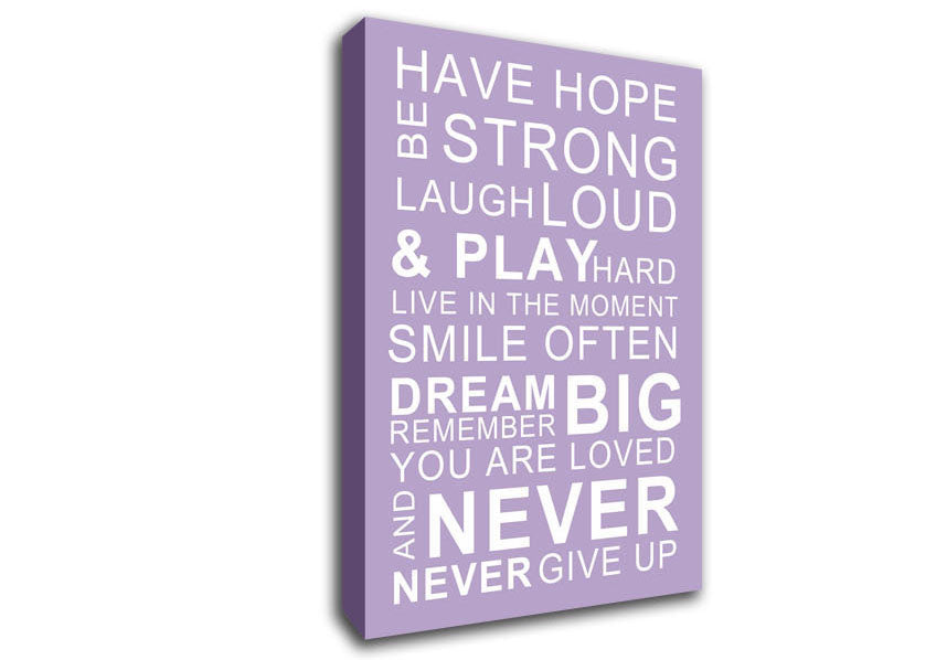 Family Quote Have Hope Be Strong Laugh Loud Lilac Canvas Print handmade in the UK. Stretched over a 2 inch thick wooden box frame, ready to hang on your wall.