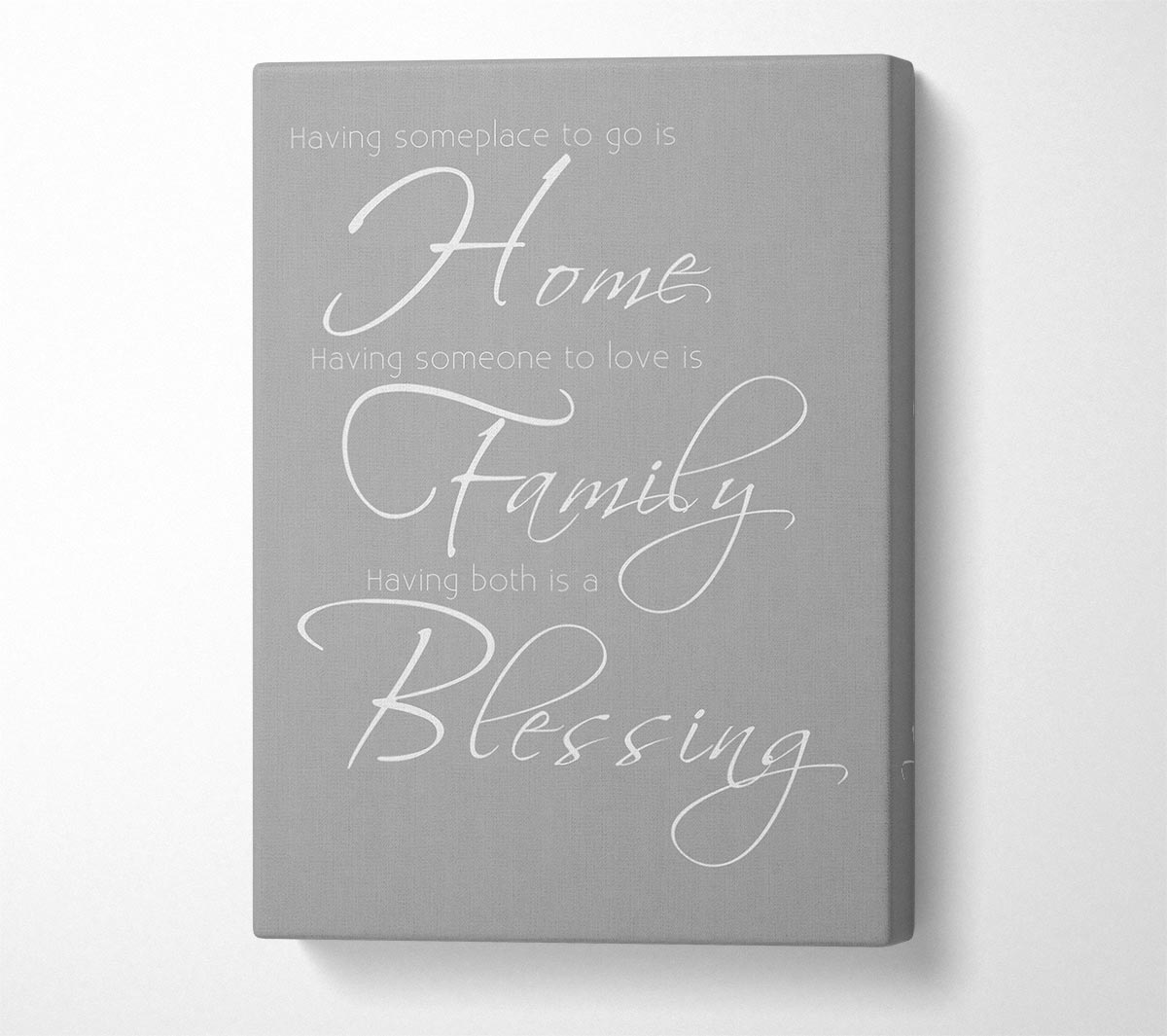 Family Quote Having Someplace To Go Is Home 2 Grey White Canvas Print handmade in the UK. Stretched over a 2 inch thick wooden box frame, ready to hang on your wall.