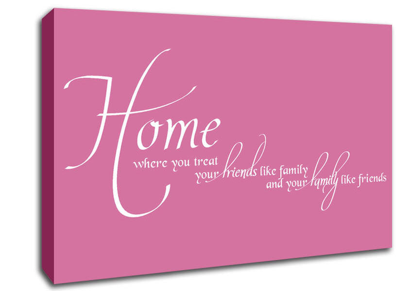 Family Quote Home Family Friends Pink Canvas Print handmade in the UK. Stretched over a 2 inch thick wooden box frame, ready to hang on your wall.
