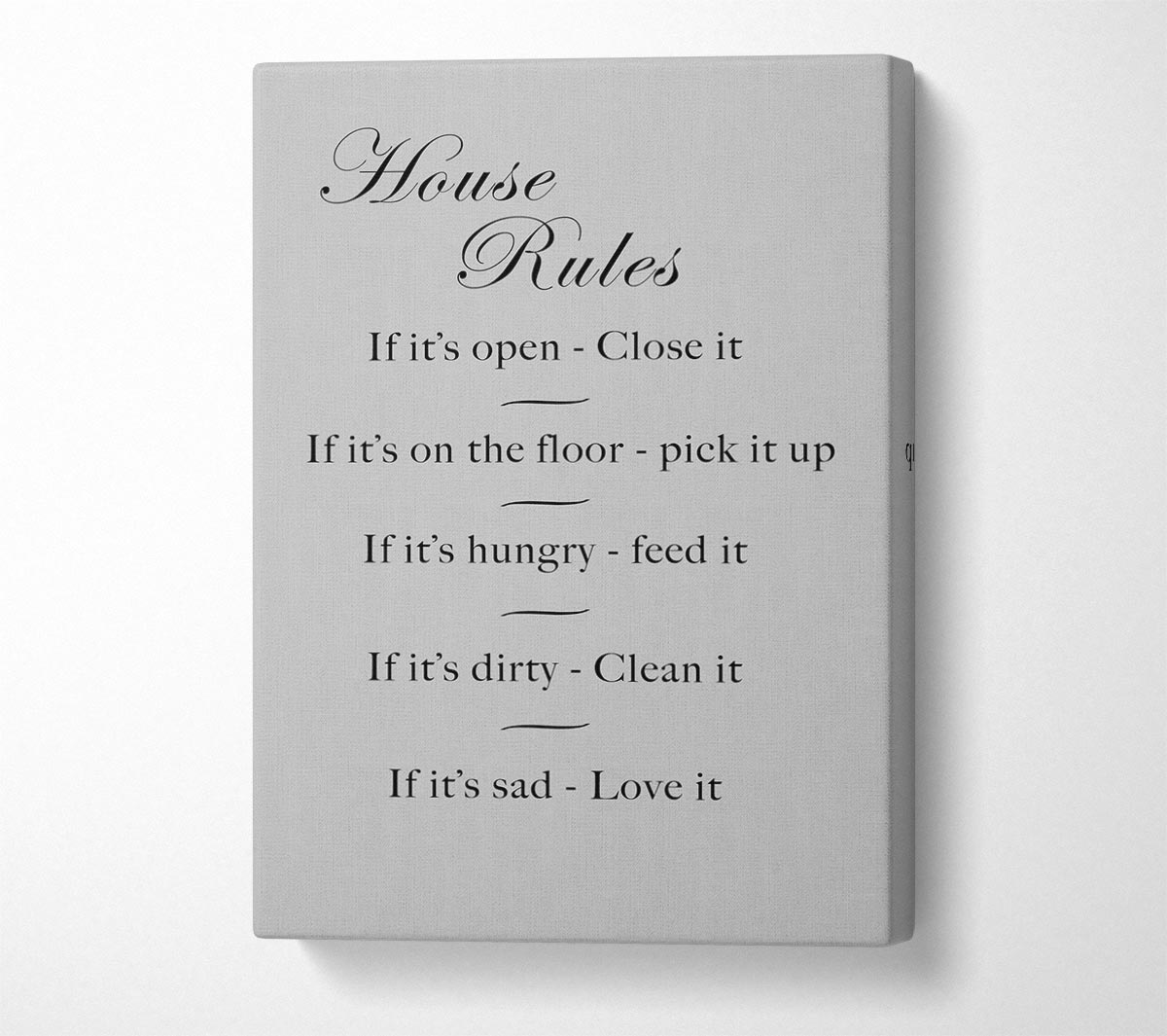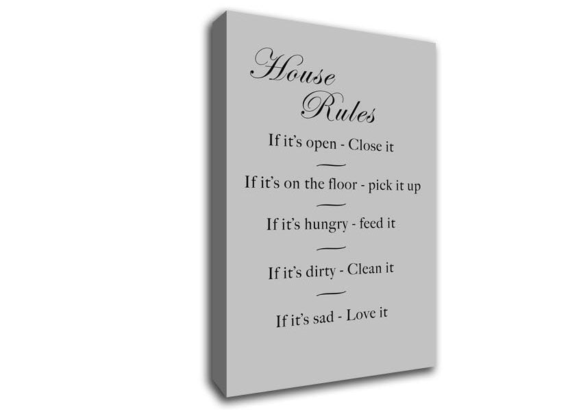 Family Quote House Rules 2 Grey Canvas Print handmade in the UK. Stretched over a 2 inch thick wooden box frame, ready to hang on your wall.