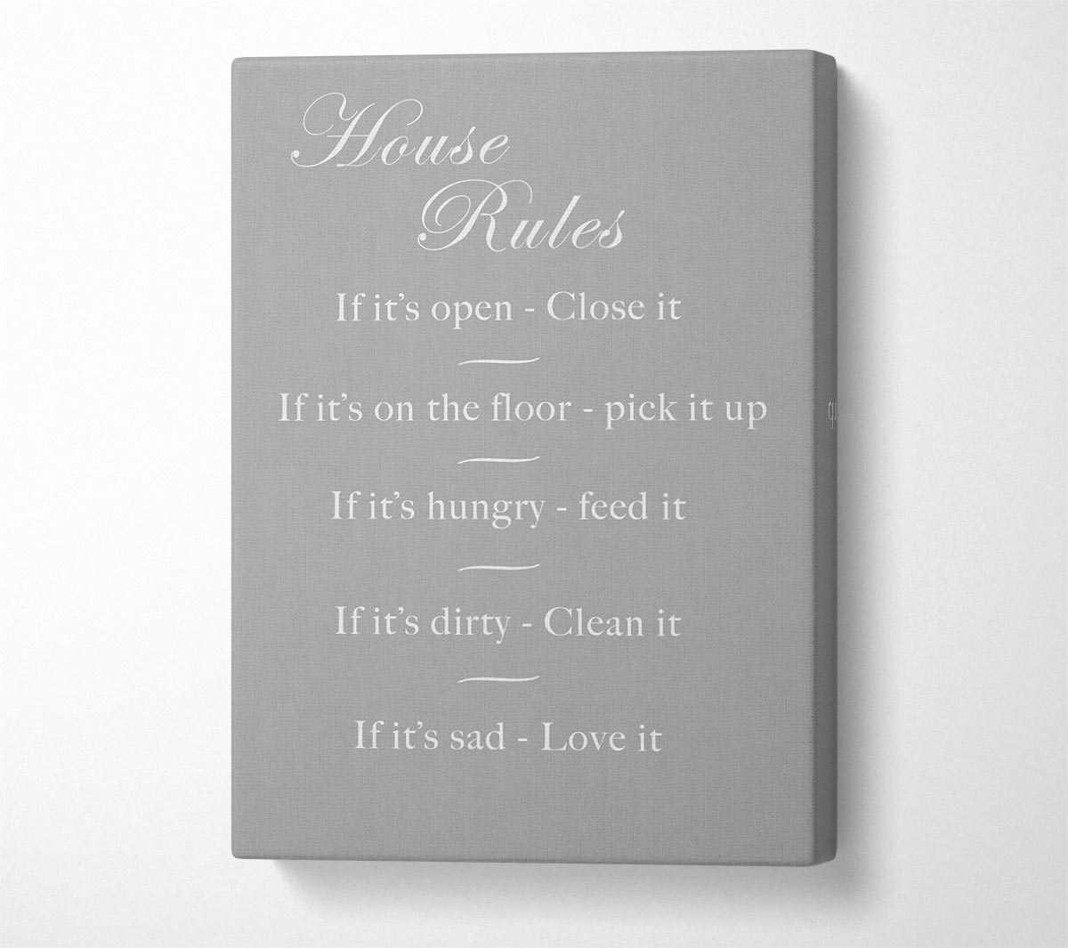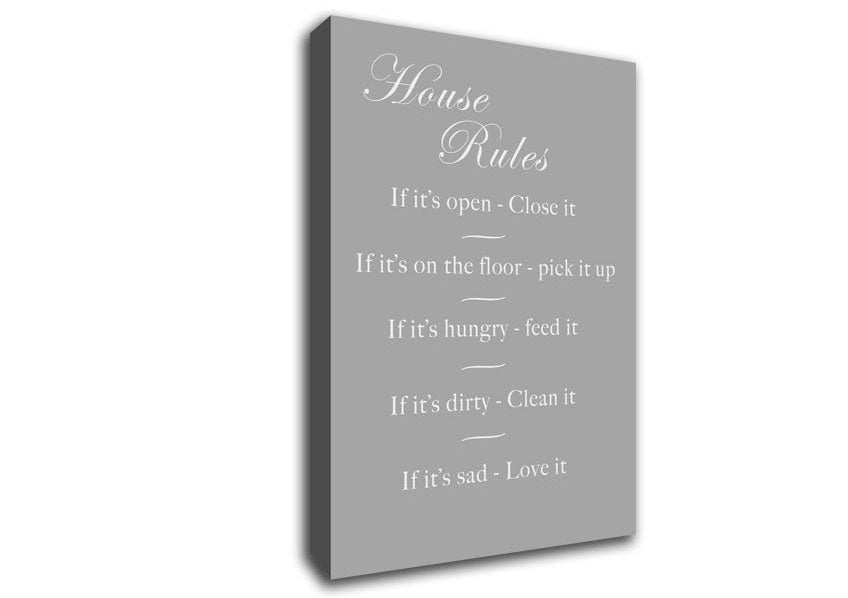 Family Quote House Rules 2 Grey White Canvas Print handmade in the UK. Stretched over a 2 inch thick wooden box frame, ready to hang on your wall.