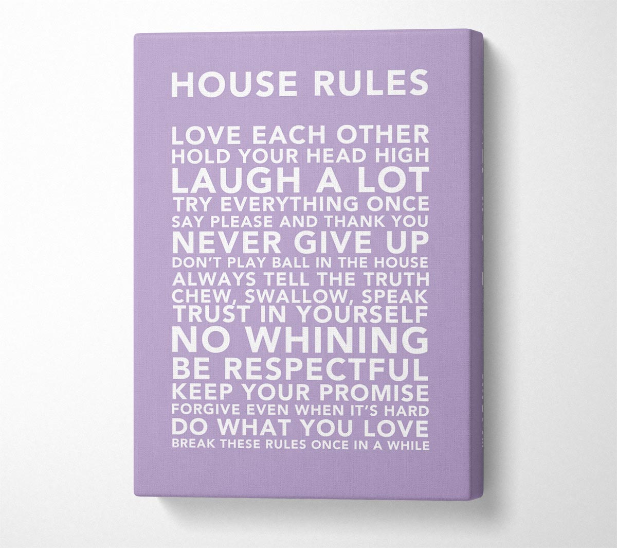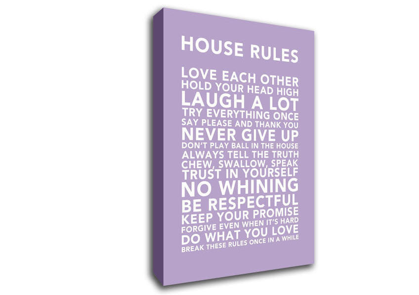 Family Quote House Rules 3 Lilac Canvas Print handmade in the UK. Stretched over a 2 inch thick wooden box frame, ready to hang on your wall.