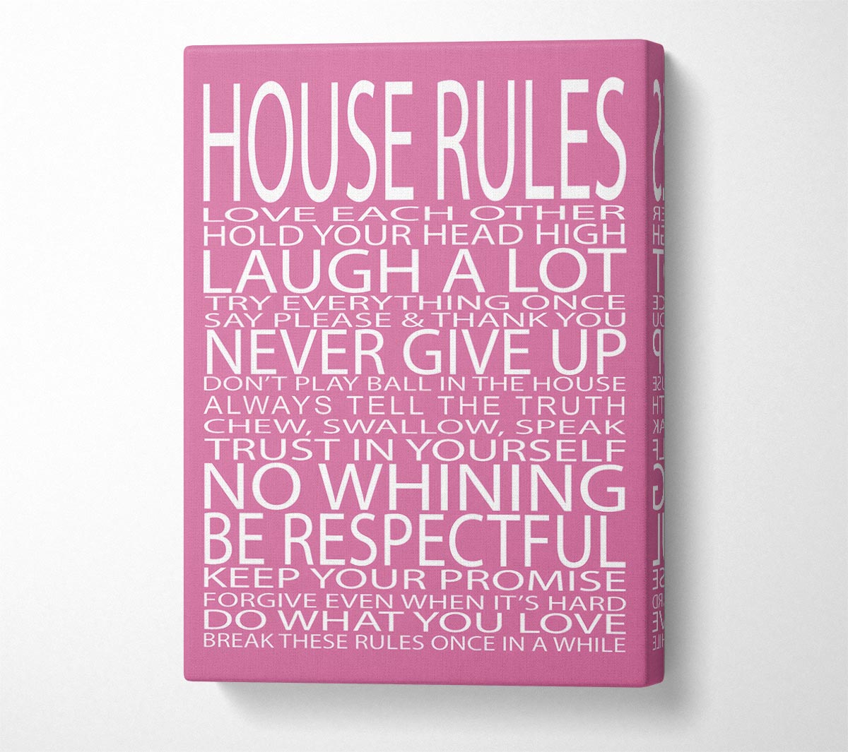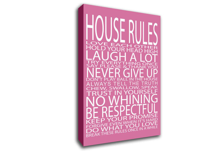 Family Quote House Rules Love Each Other Pink Canvas Print handmade in the UK. Stretched over a 2 inch thick wooden box frame, ready to hang on your wall.