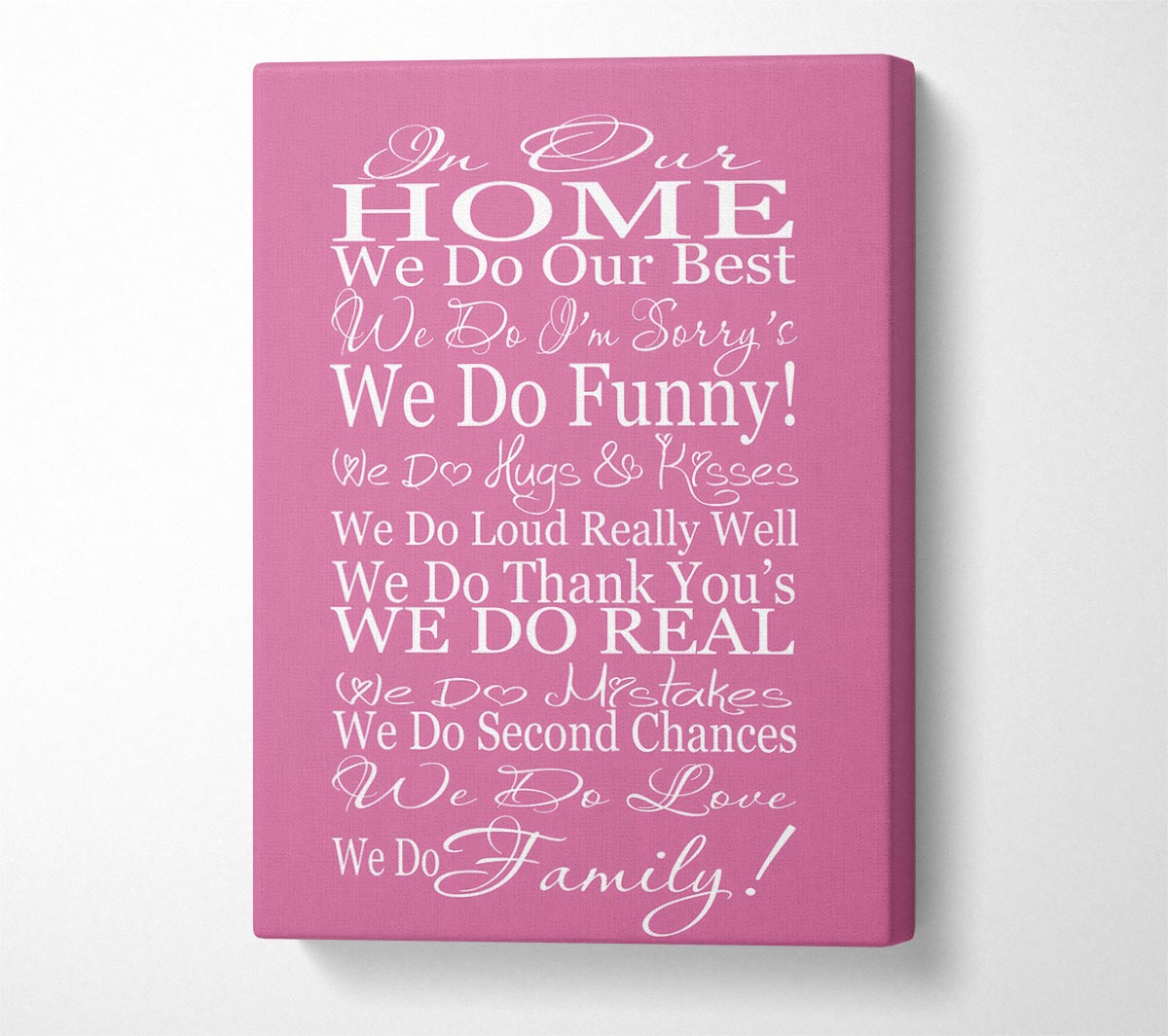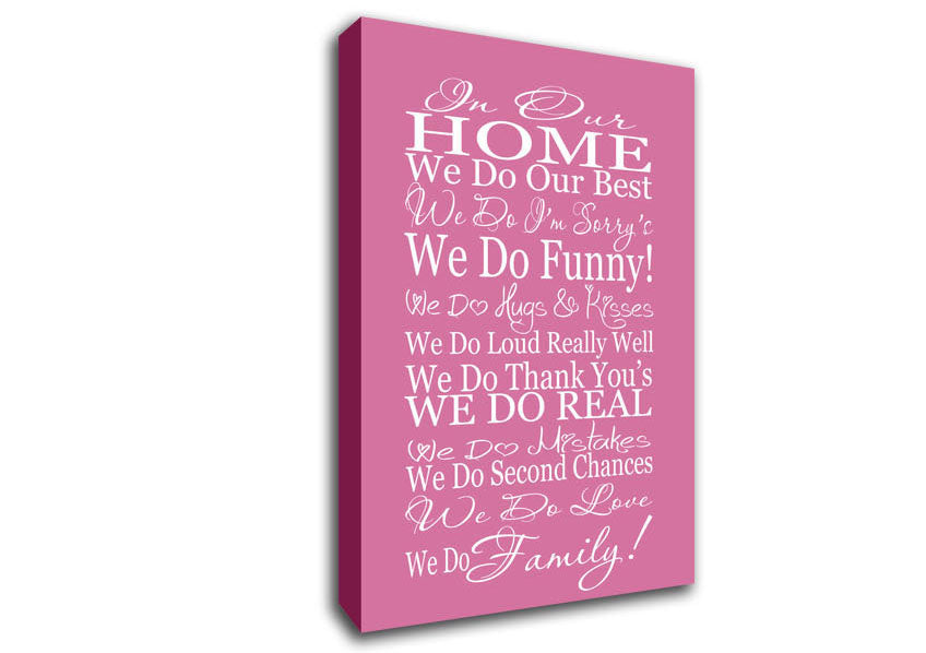 Family Quote In Our Home We Do Family Pink Canvas Print handmade in the UK. Stretched over a 2 inch thick wooden box frame, ready to hang on your wall.