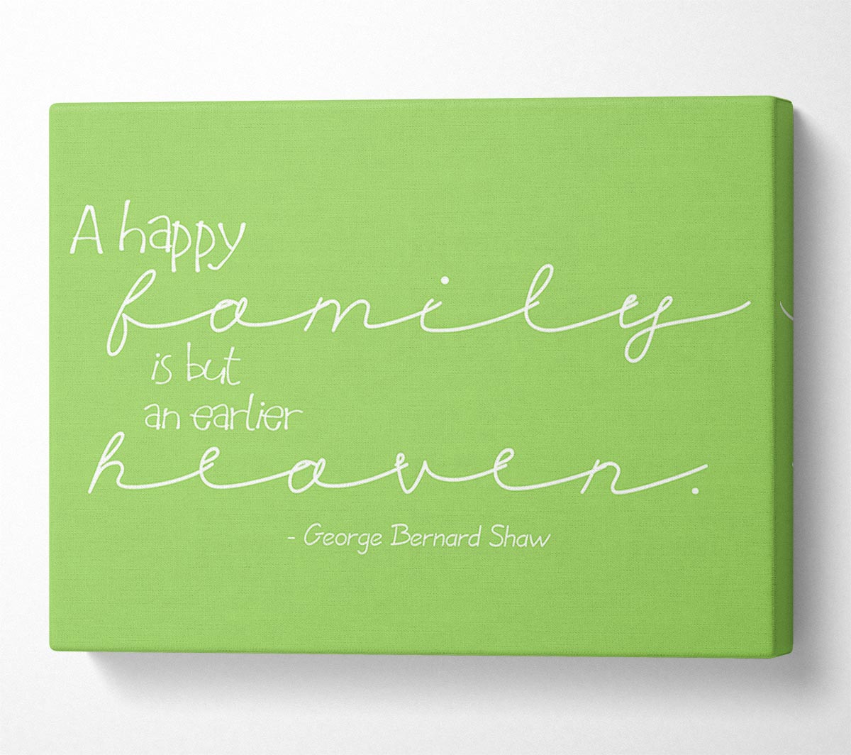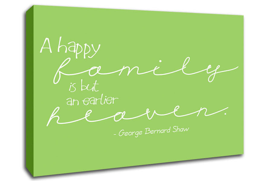 Famous Quote George Bernard Shaw A Happy Family Lime Green Canvas Print handmade in the UK. Stretched over a 2 inch thick wooden box frame, ready to hang on your wall.