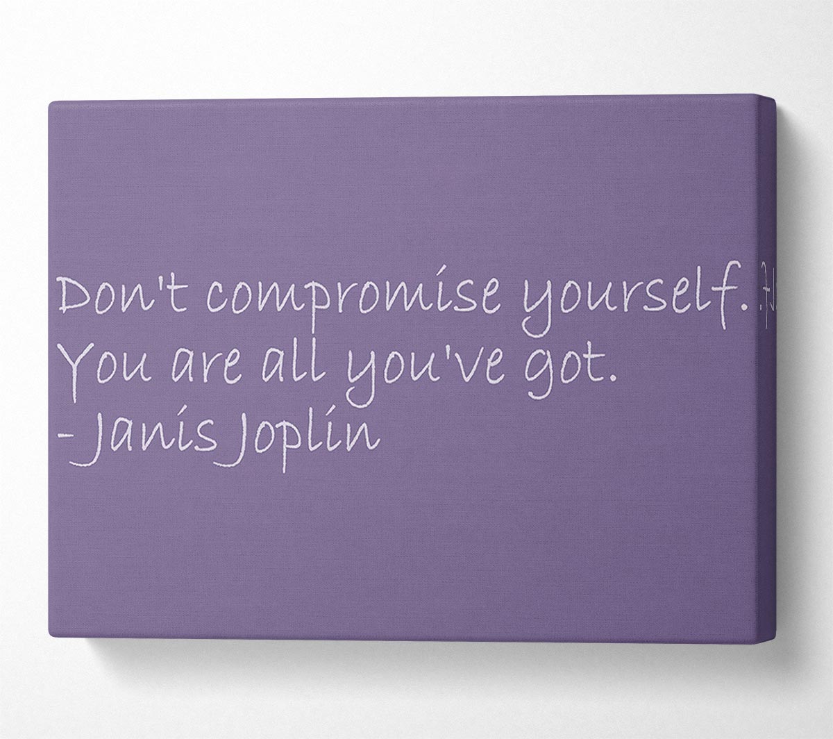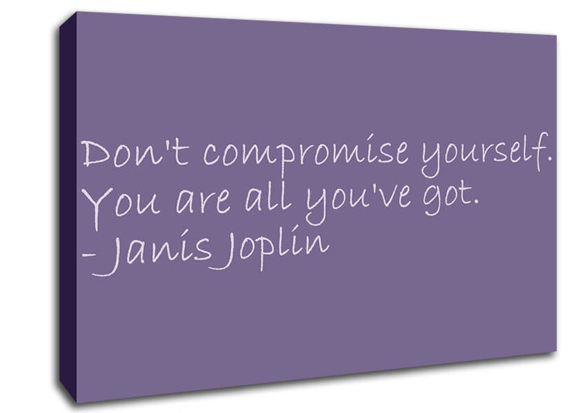 Famous Quote Janis Joplin Dont Compromise Yourself Lilac Canvas Print handmade in the UK. Stretched over a 2 inch thick wooden box frame, ready to hang on your wall.