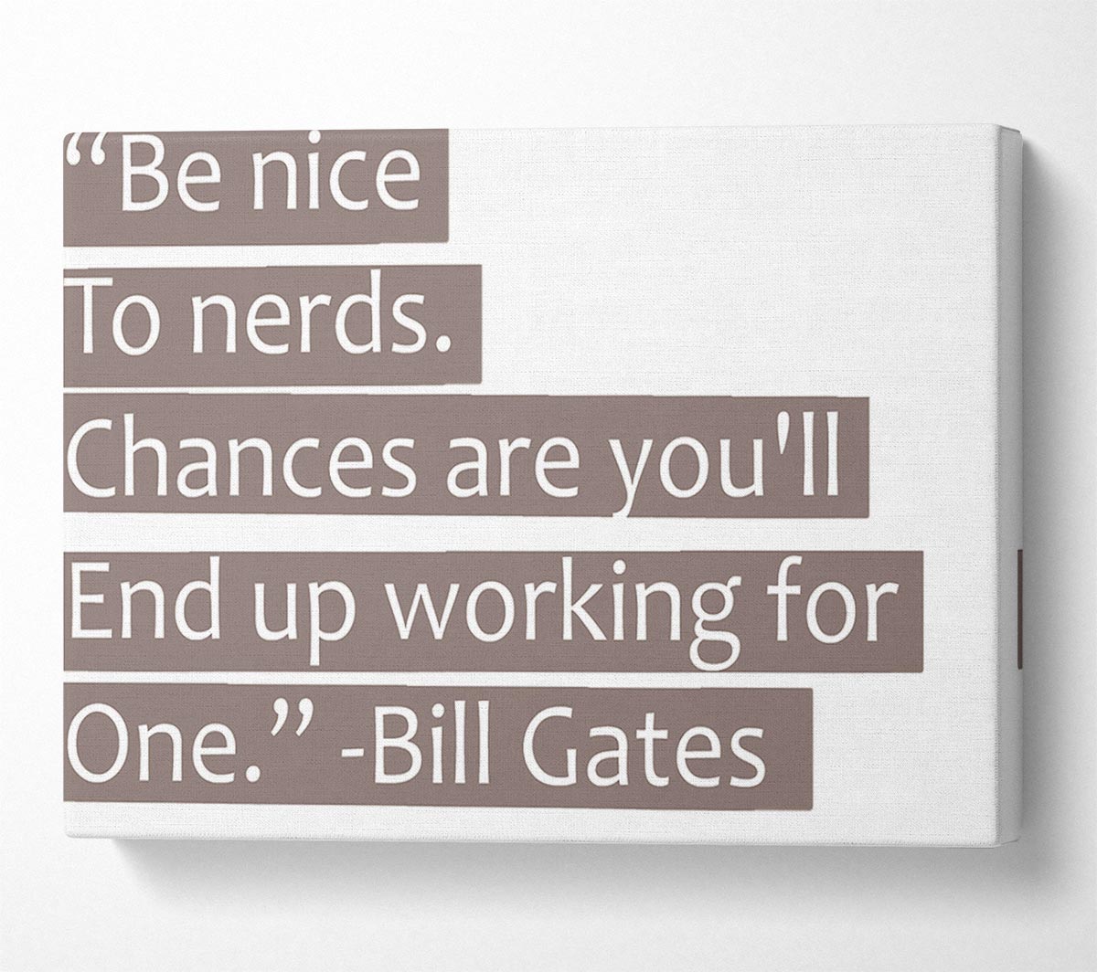 Funny Quote Bill Gates Be Nice To Nerds Beige Canvas Print handmade in the UK. Stretched over a 2 inch thick wooden box frame, ready to hang on your wall.