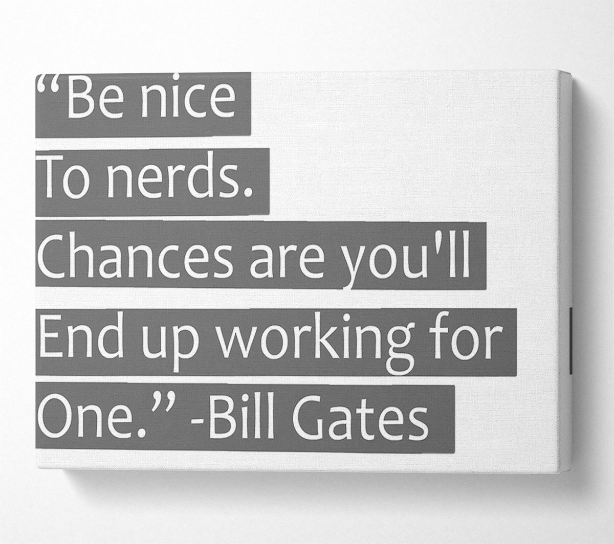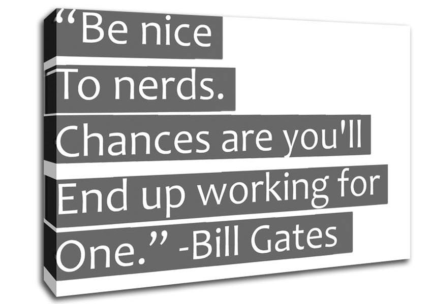 Funny Quote Bill Gates Be Nice To Nerds Grey Canvas Print handmade in the UK. Stretched over a 2 inch thick wooden box frame, ready to hang on your wall.