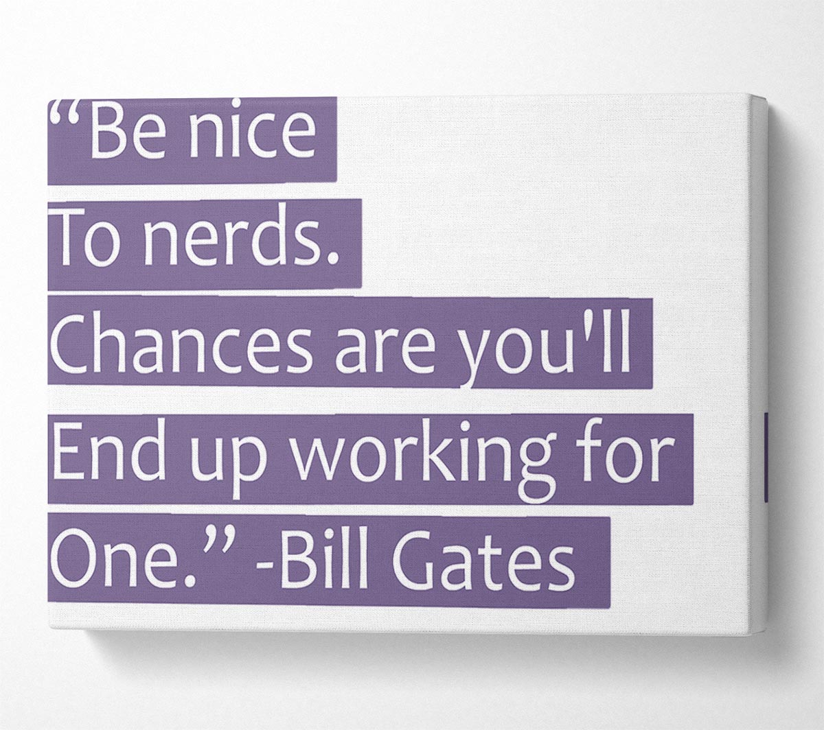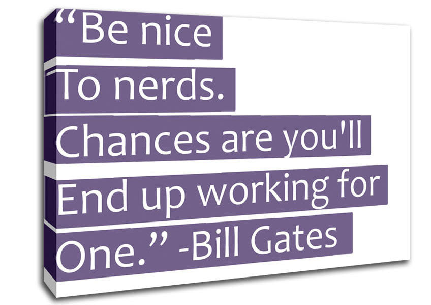 Funny Quote Bill Gates Be Nice To Nerds Lilac Canvas Print handmade in the UK. Stretched over a 2 inch thick wooden box frame, ready to hang on your wall.