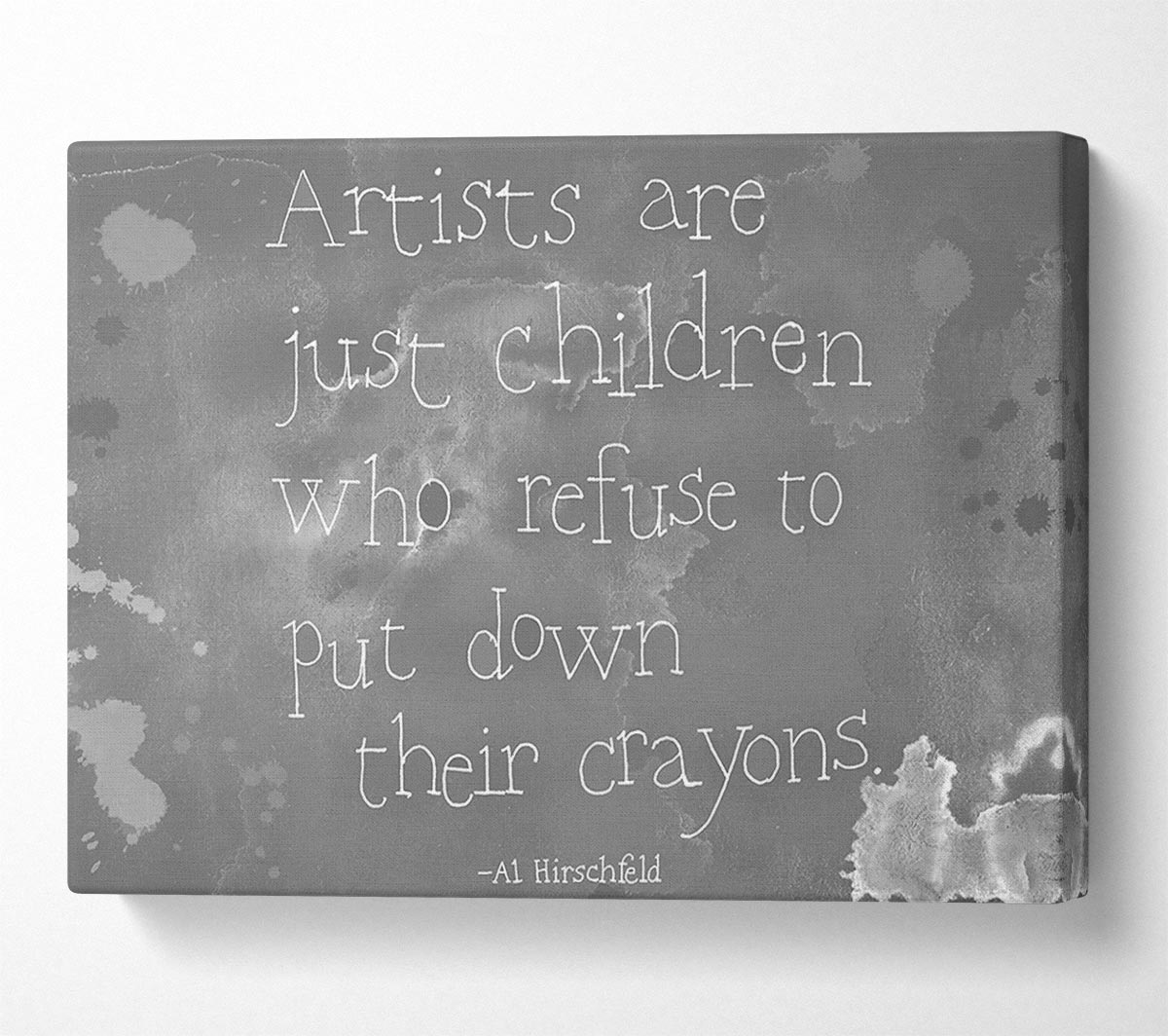Funny Quote Hirschfeld Artists Are Just Children Grey Canvas Print handmade in the UK. Stretched over a 2 inch thick wooden box frame, ready to hang on your wall.
