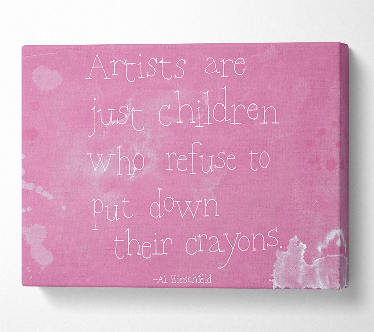 Funny Quote Hirschfeld Artists Are Just Children Pink Canvas Print handmade in the UK. Stretched over a 2 inch thick wooden box frame, ready to hang on your wall.