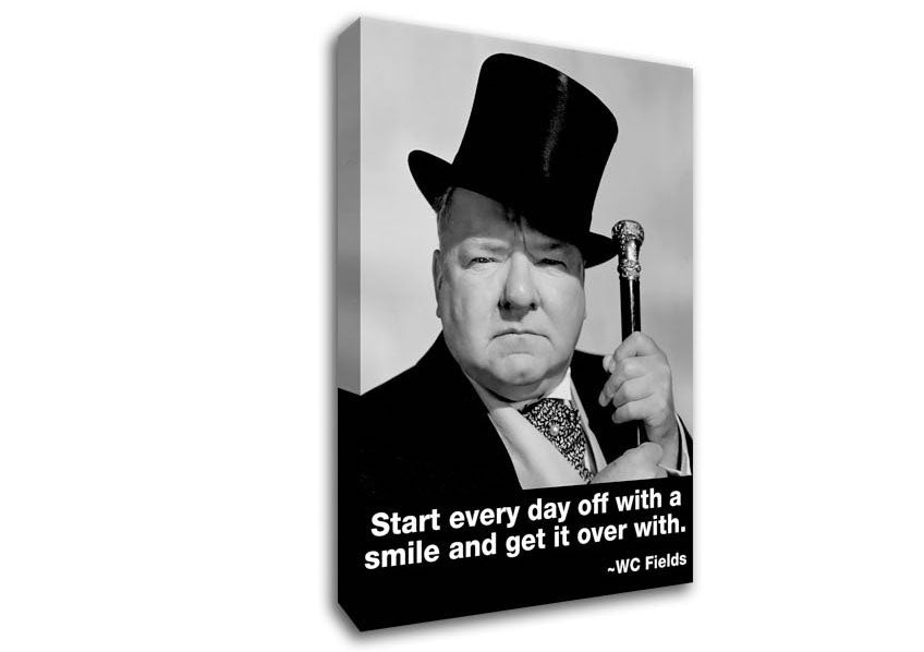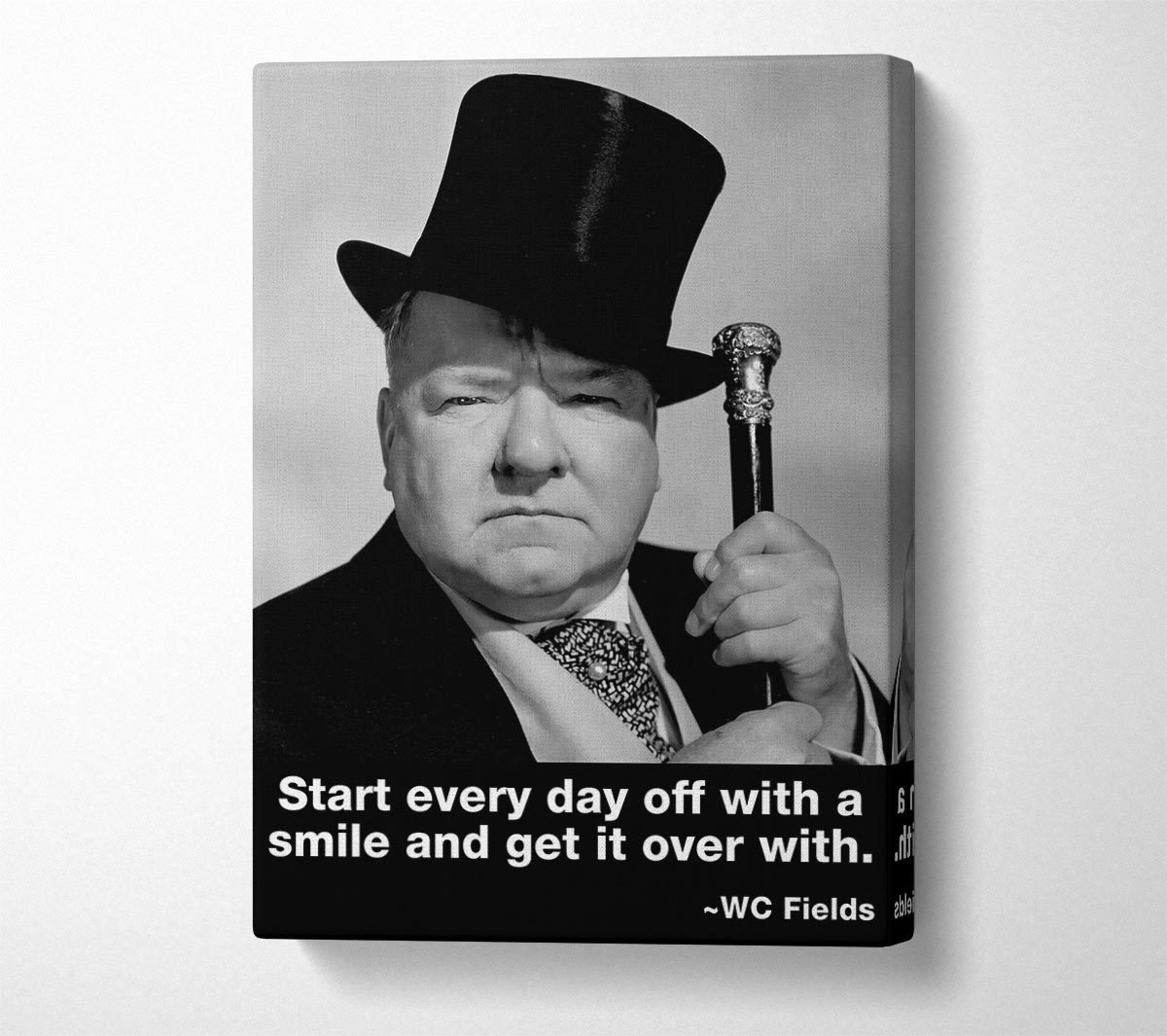 Funny Quote W C Fields Smile And Get It Over With Canvas Print handmade in the UK. Stretched over a 2 inch thick wooden box frame, ready to hang on your wall.