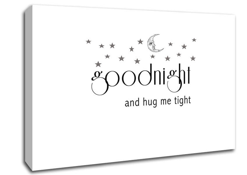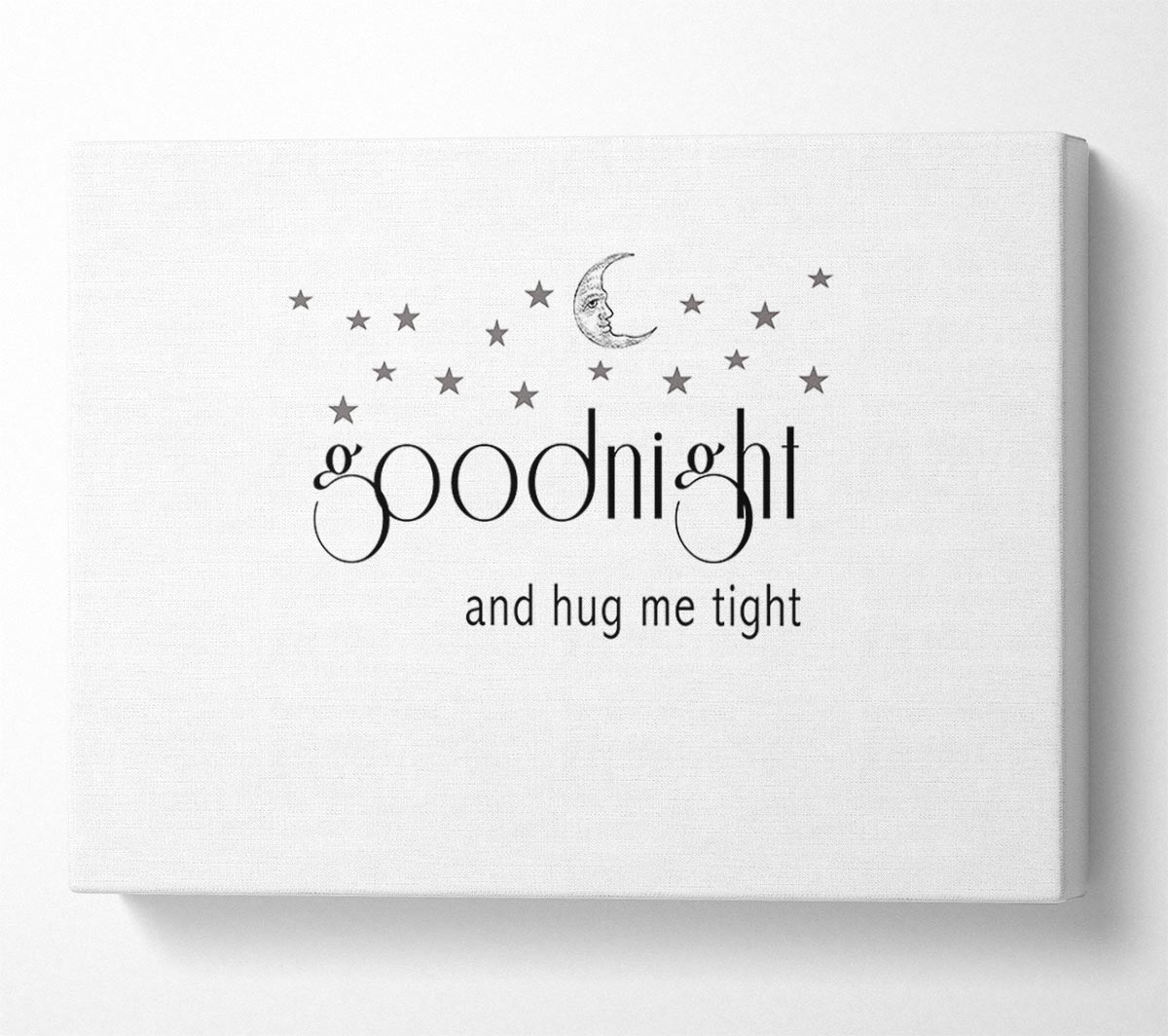 Girls Room Quote Good Night And Hug Me Tight White Canvas Print handmade in the UK. Stretched over a 2 inch thick wooden box frame, ready to hang on your wall.