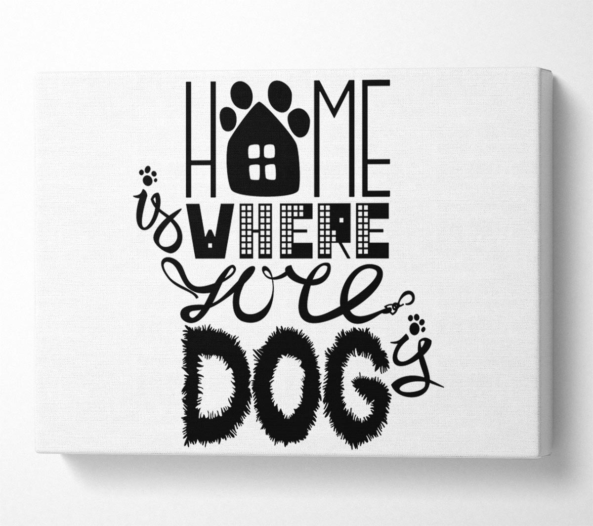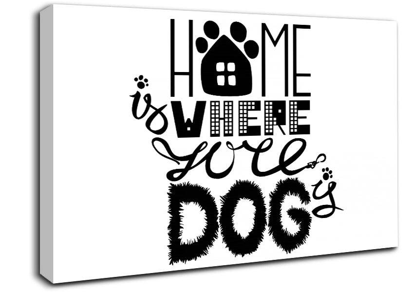 Home Is Where The Dog Is 2 Canvas Print handmade in the UK. Stretched over a 2 inch thick wooden box frame, ready to hang on your wall.