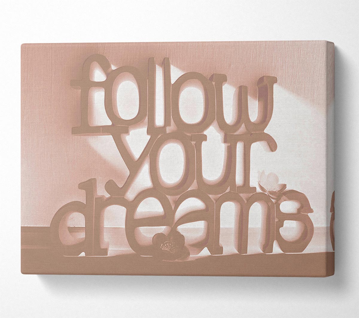 Home Quote Follow Your Dreams Beige Canvas Print handmade in the UK. Stretched over a 2 inch thick wooden box frame, ready to hang on your wall.