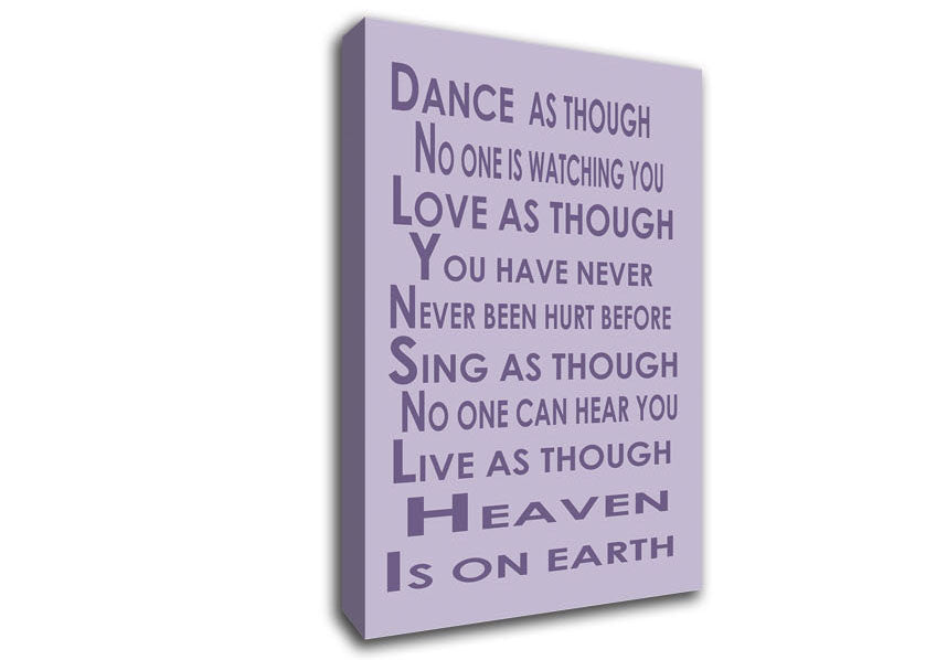 Home Quote Heaven Is On Earth Lilac Canvas Print handmade in the UK. Stretched over a 2 inch thick wooden box frame, ready to hang on your wall.