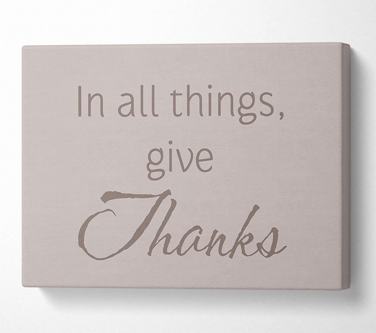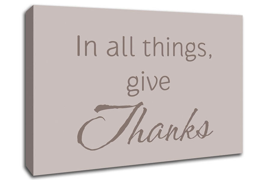 Home Quote In All Things Give Thanks Beige Canvas Print handmade in the UK. Stretched over a 2 inch thick wooden box frame, ready to hang on your wall.