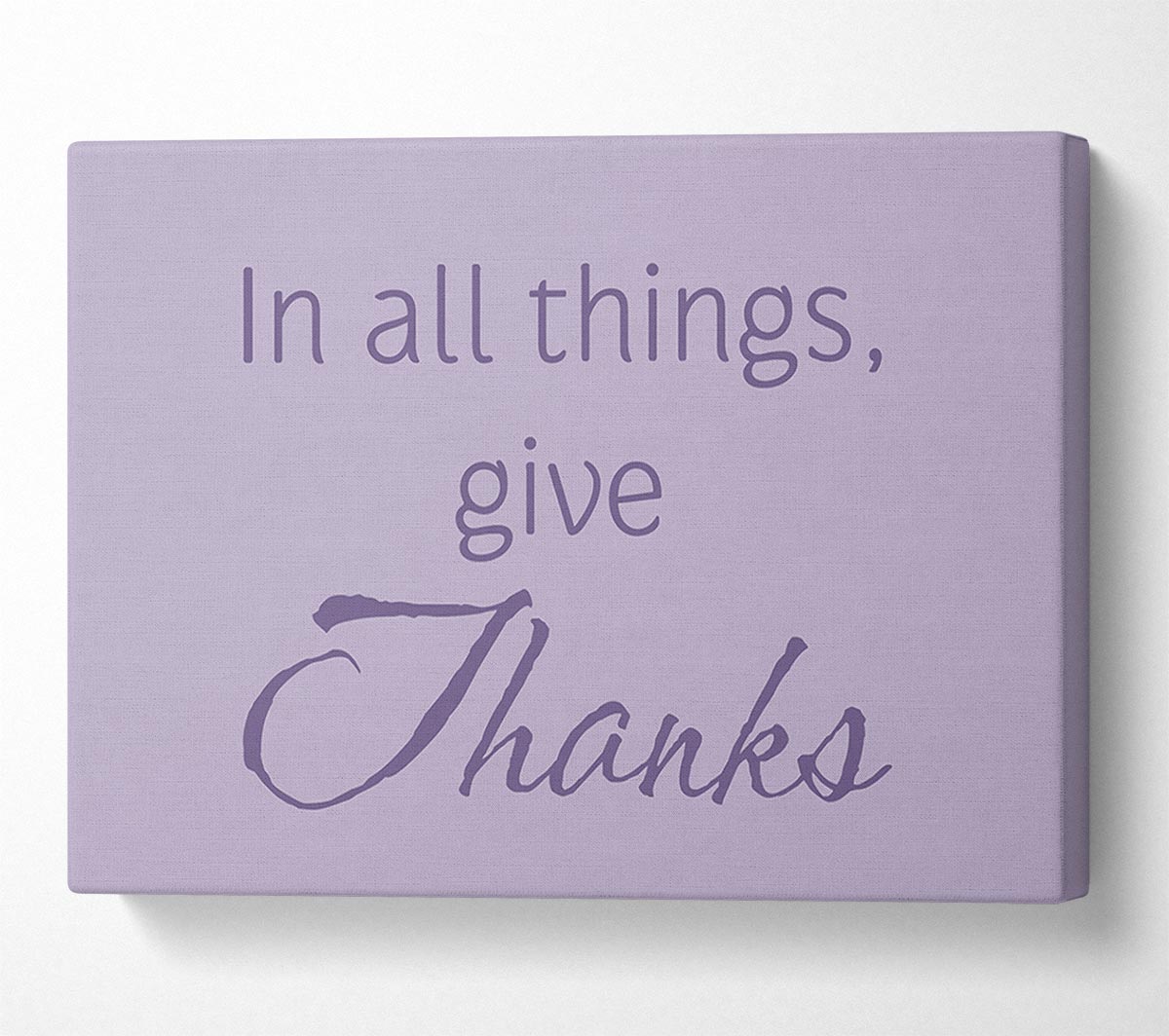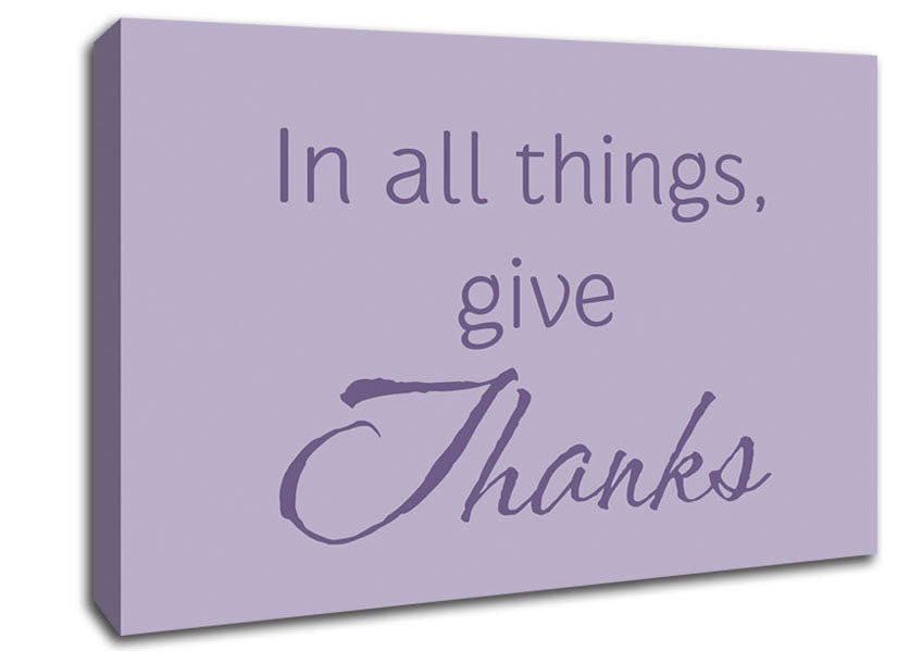 Home Quote In All Things Give Thanks Lilac Canvas Print handmade in the UK. Stretched over a 2 inch thick wooden box frame, ready to hang on your wall.