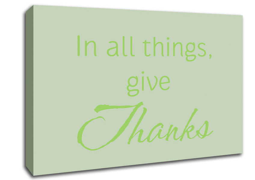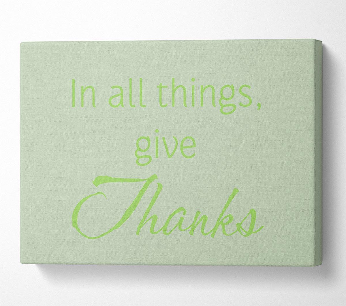 Home Quote In All Things Give Thanks Lime Green Canvas Print handmade in the UK. Stretched over a 2 inch thick wooden box frame, ready to hang on your wall.