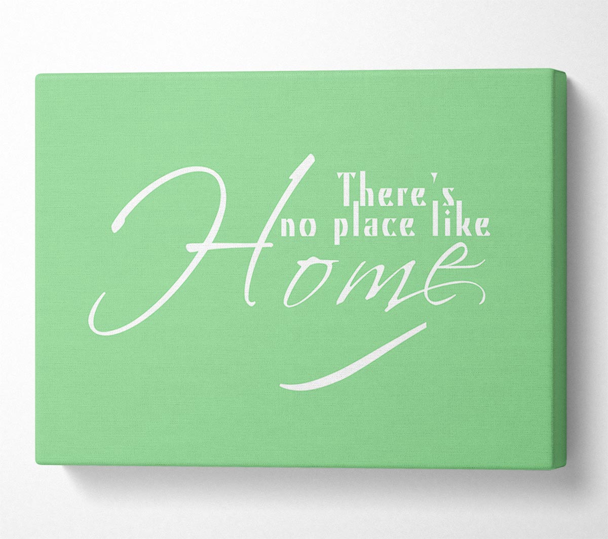 Home Quote Theres No Place Like Home Green Canvas Print handmade in the UK. Stretched over a 2 inch thick wooden box frame, ready to hang on your wall.