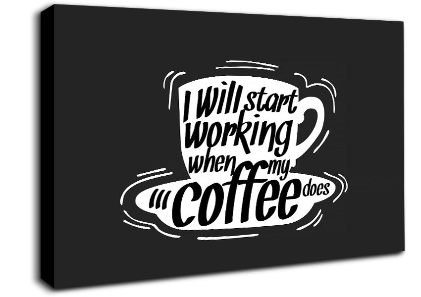 I Will Start Working When Coffee Does Canvas Print handmade in the UK. Stretched over a 2 inch thick wooden box frame, ready to hang on your wall.