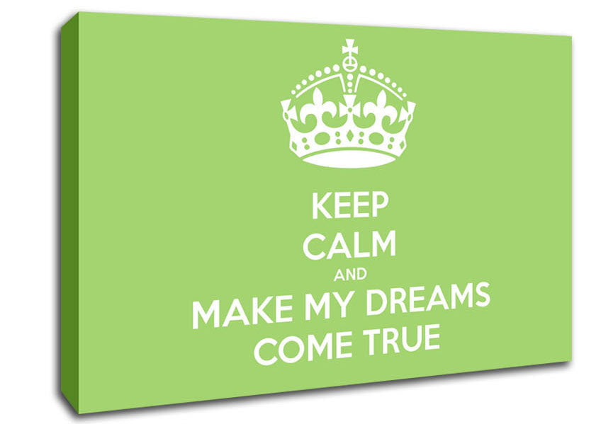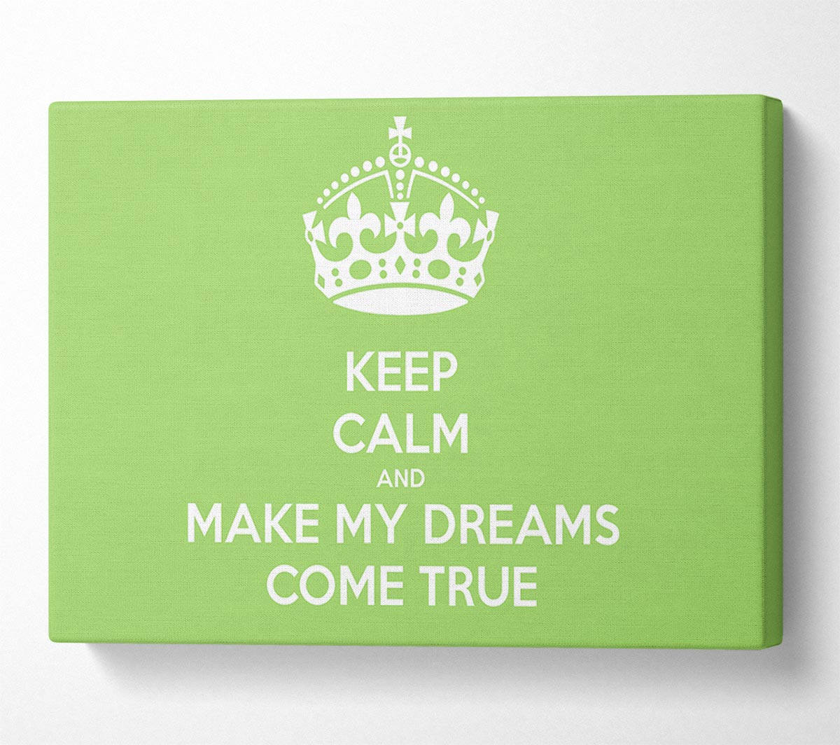 Keep Calm Make Your Dreams Come True Lime Green Canvas Print handmade in the UK. Stretched over a 2 inch thick wooden box frame, ready to hang on your wall.