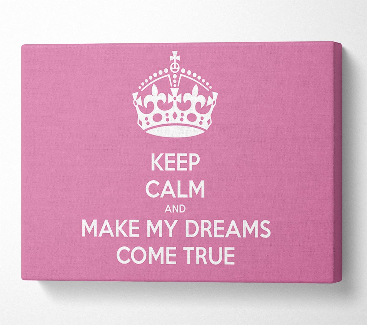 Keep Calm Make Your Dreams Come True Pink Canvas Print handmade in the UK. Stretched over a 2 inch thick wooden box frame, ready to hang on your wall.
