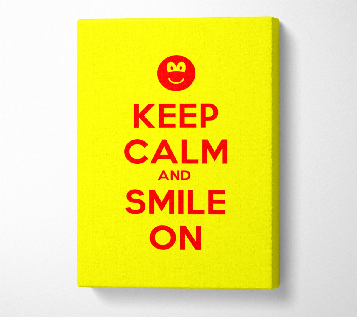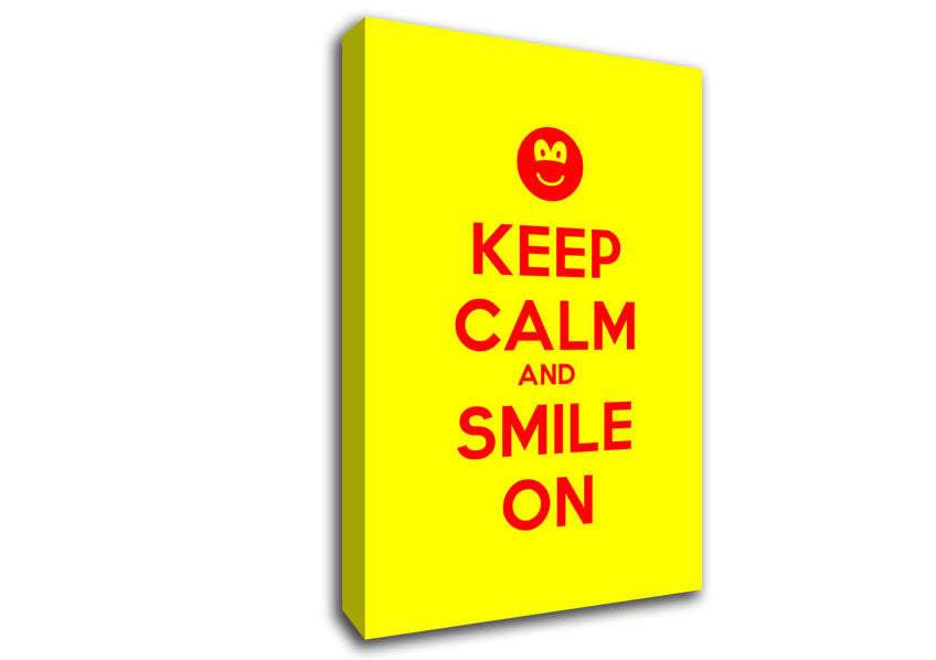 Keep Calm Smile On Yellow Canvas Print handmade in the UK. Stretched over a 2 inch thick wooden box frame, ready to hang on your wall.
