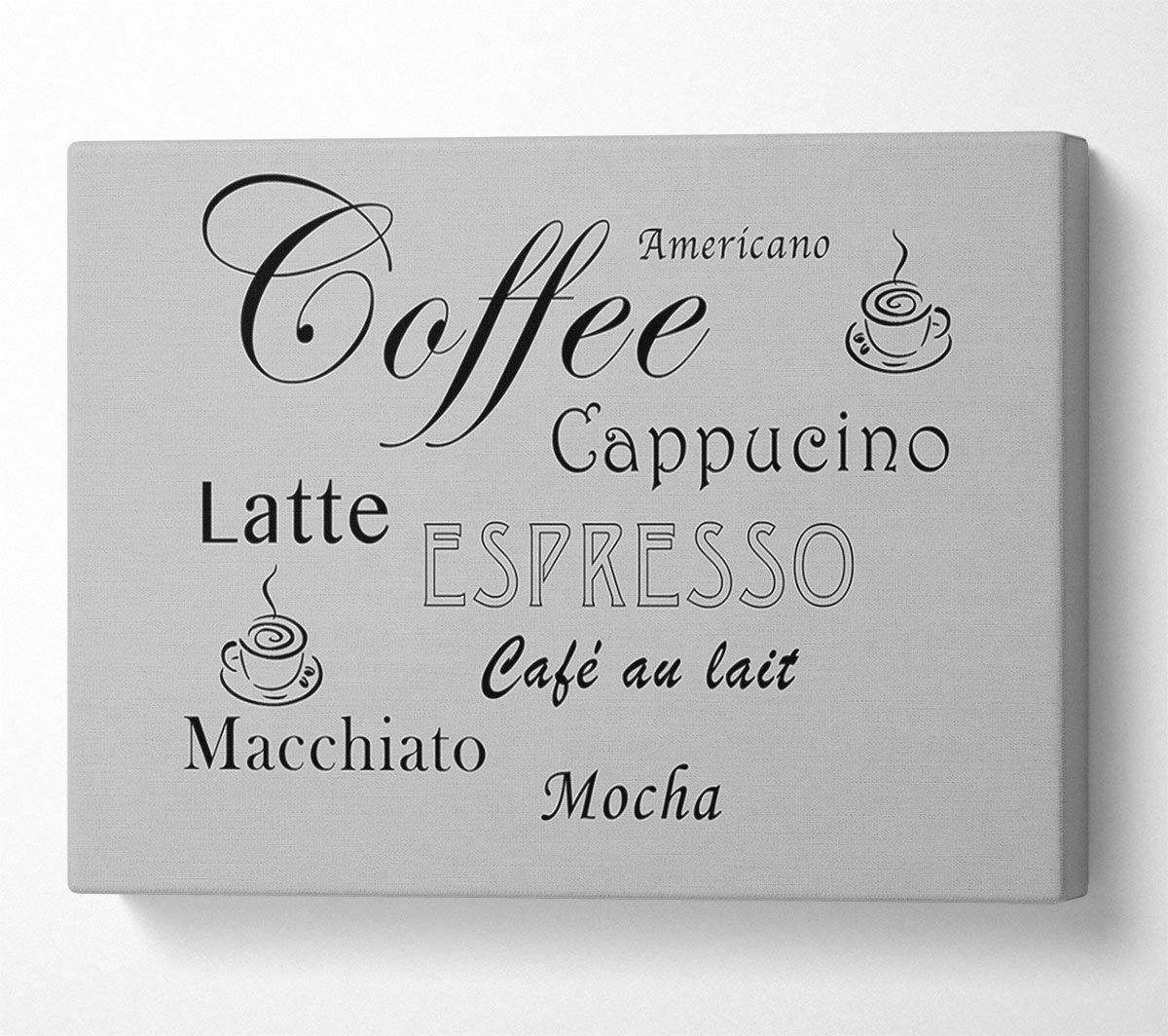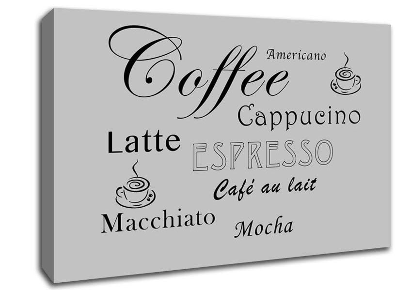 Kitchen Quote Coffee Delight Grey Canvas Print handmade in the UK. Stretched over a 2 inch thick wooden box frame, ready to hang on your wall.