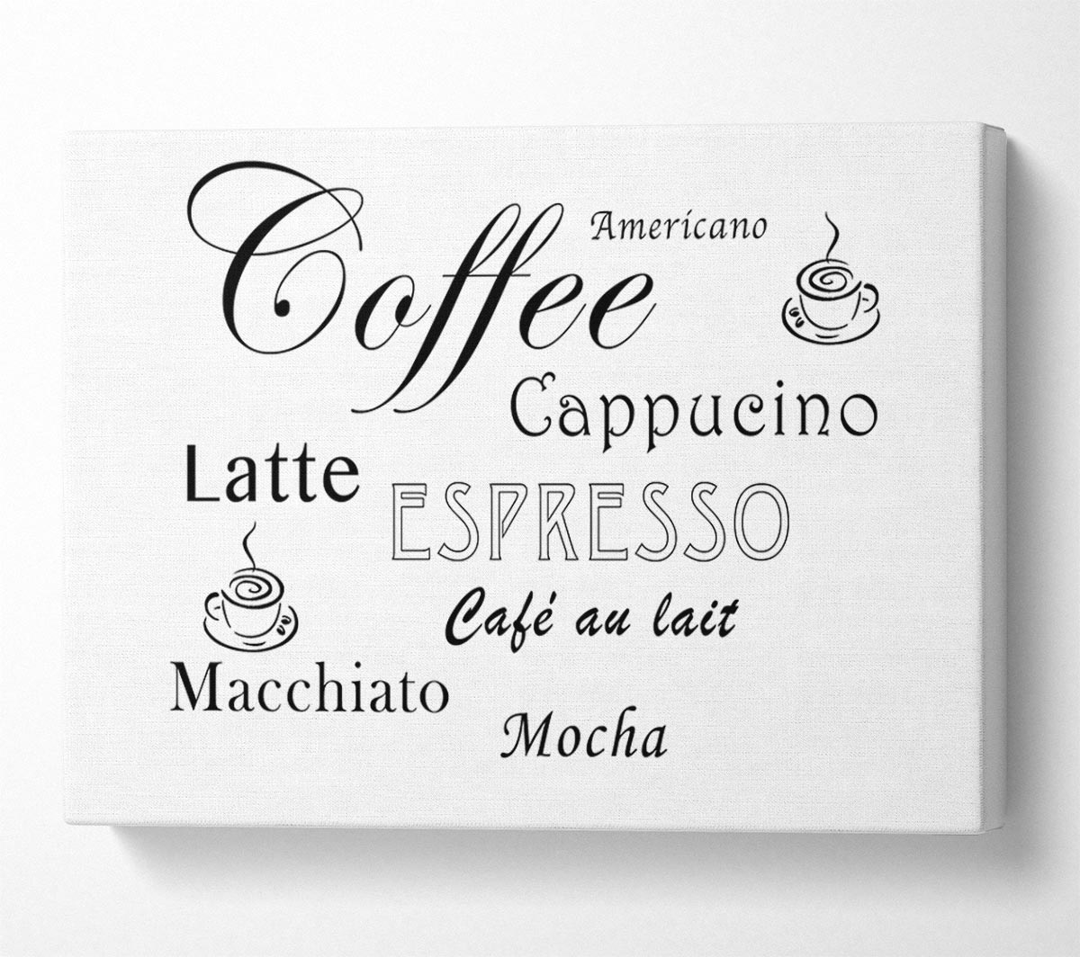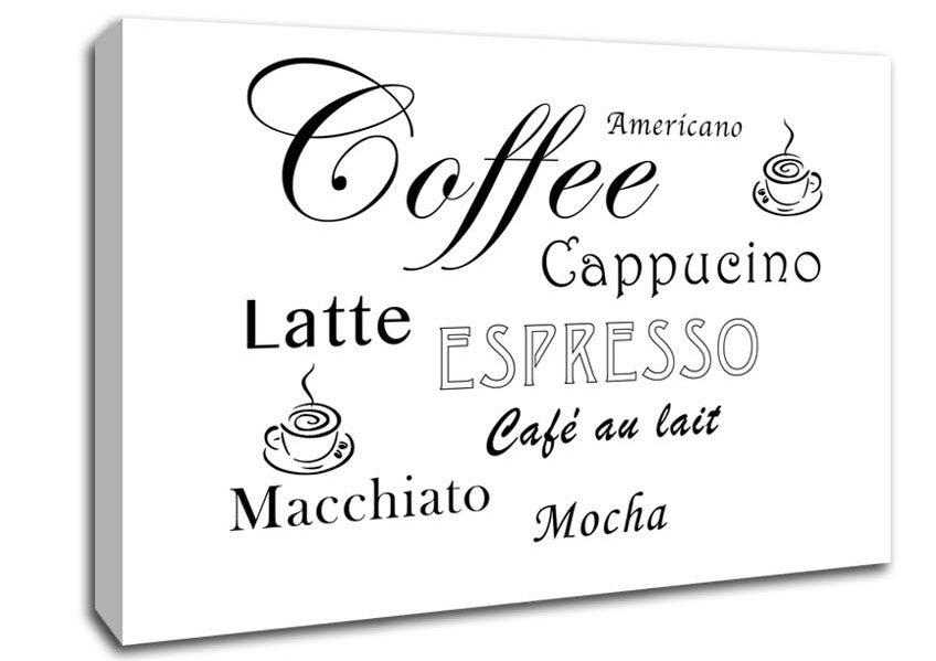 Kitchen Quote Coffee Delight White Canvas Print handmade in the UK. Stretched over a 2 inch thick wooden box frame, ready to hang on your wall.