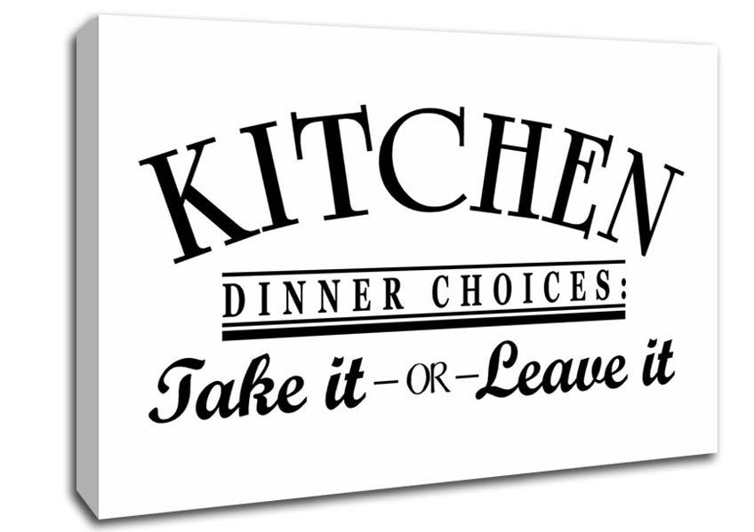 Kitchen Quote Dinner Choices Canvas Print handmade in the UK. Stretched over a 2 inch thick wooden box frame, ready to hang on your wall.